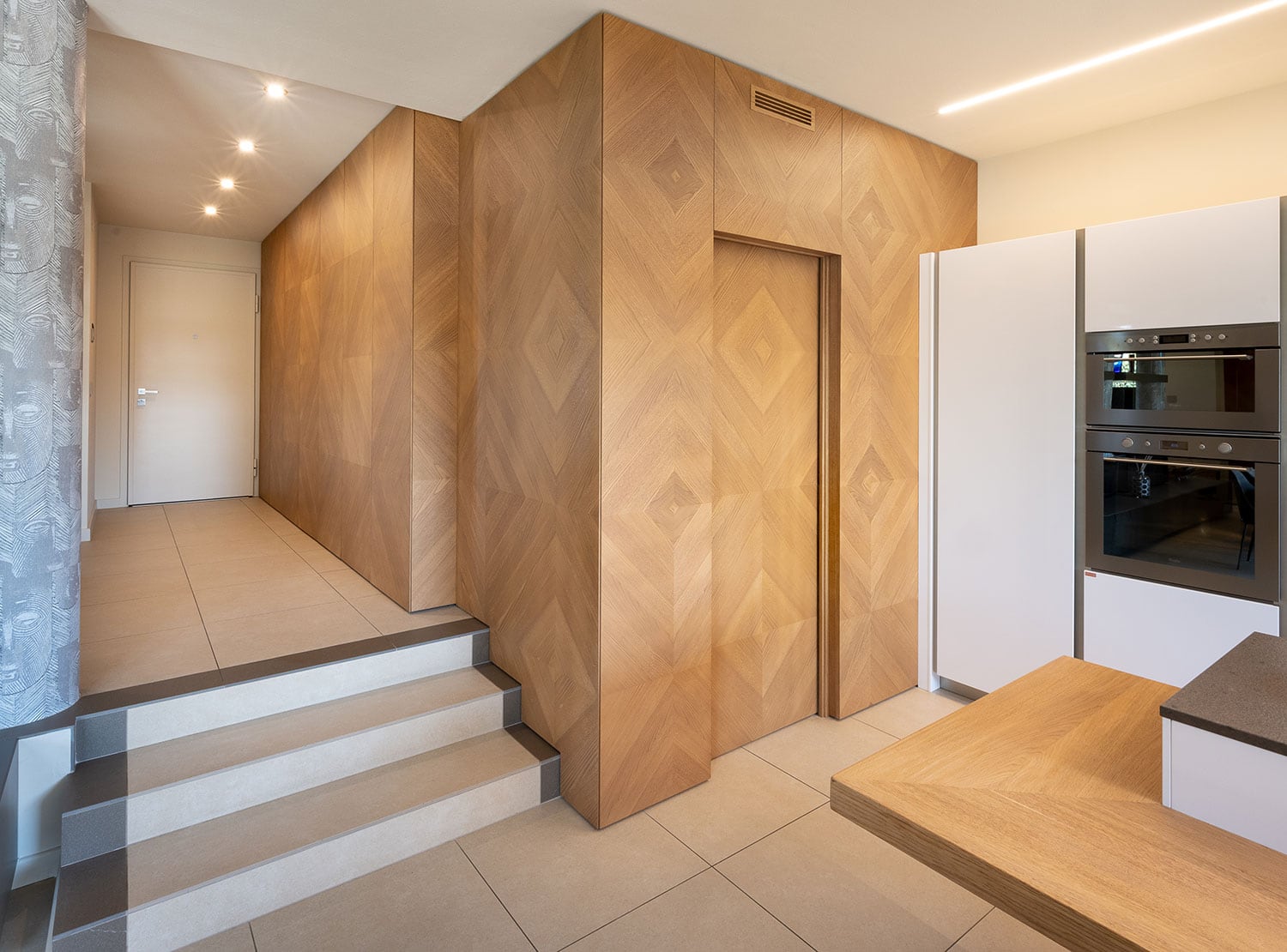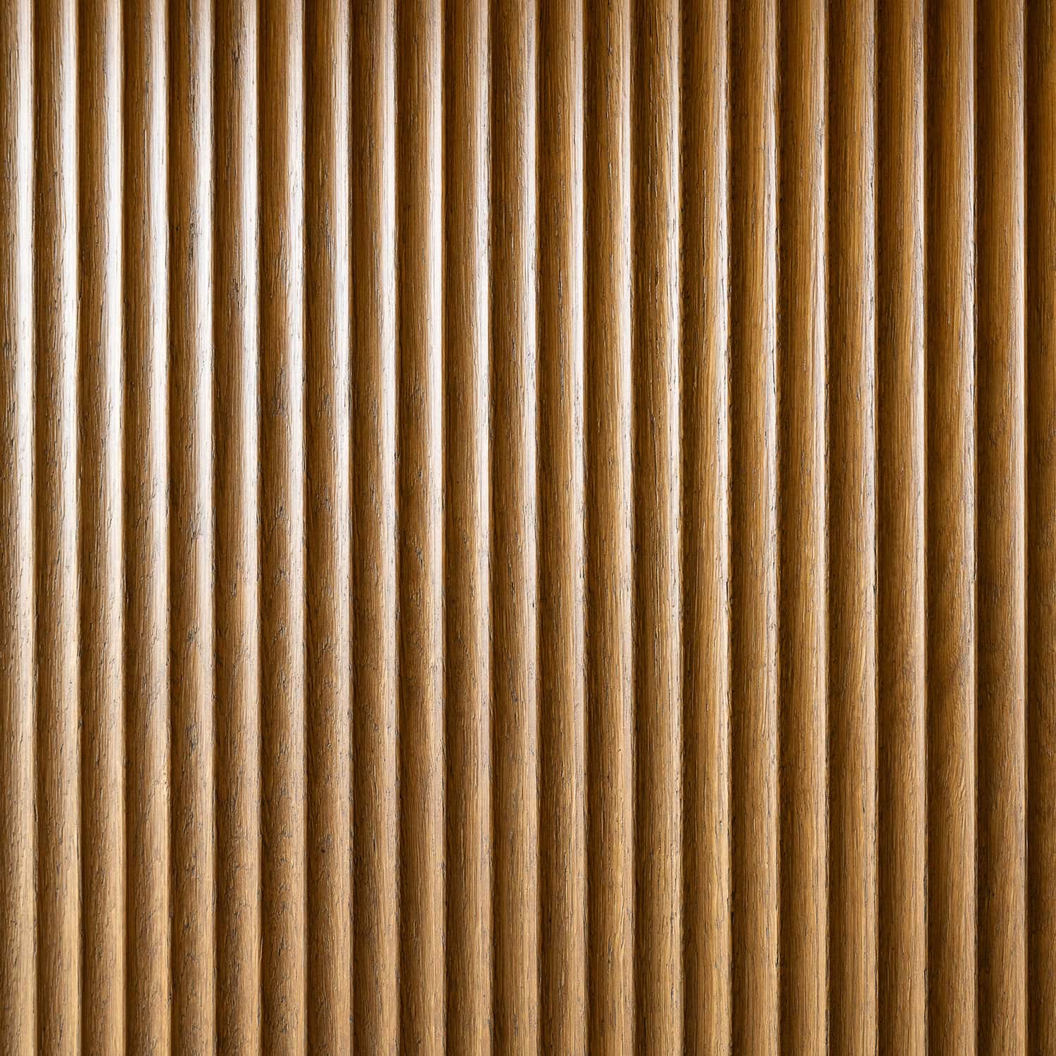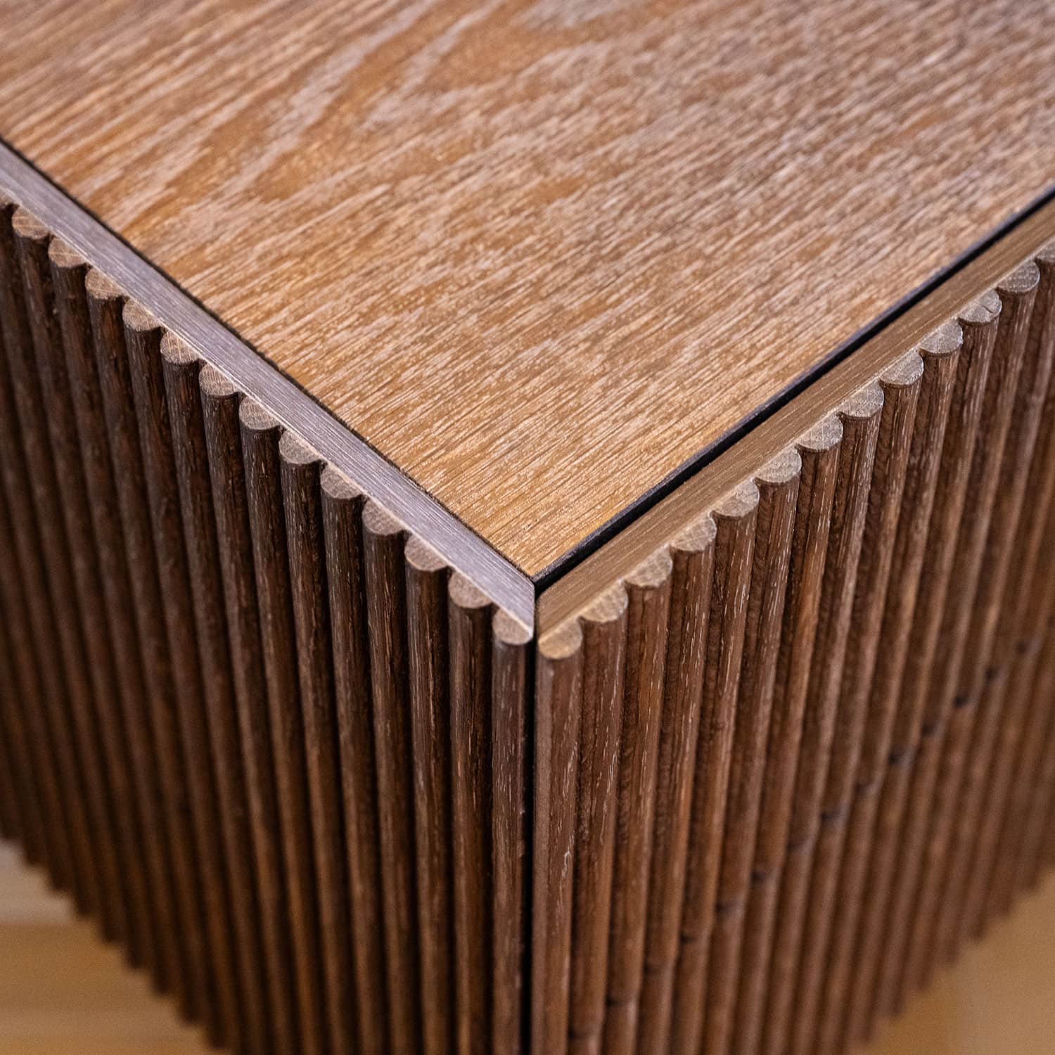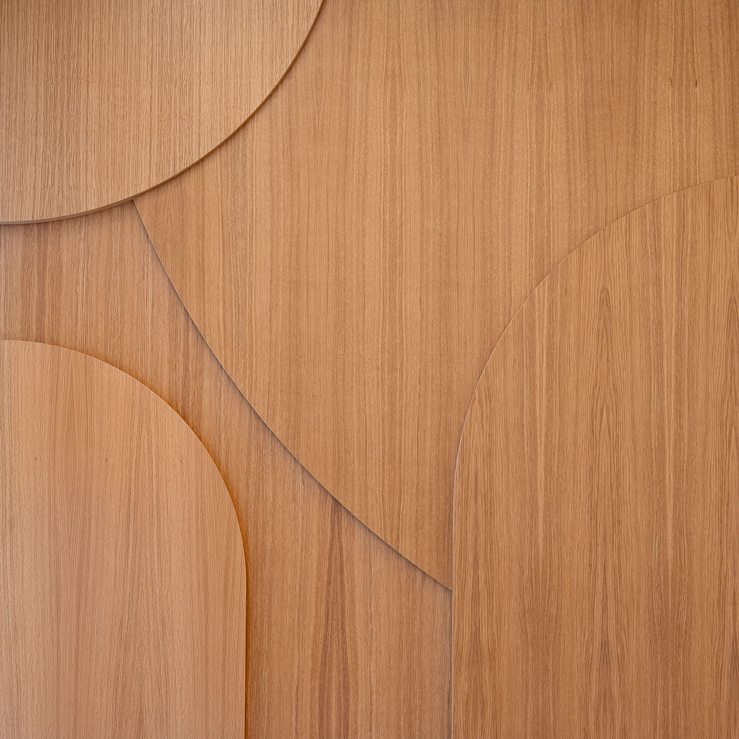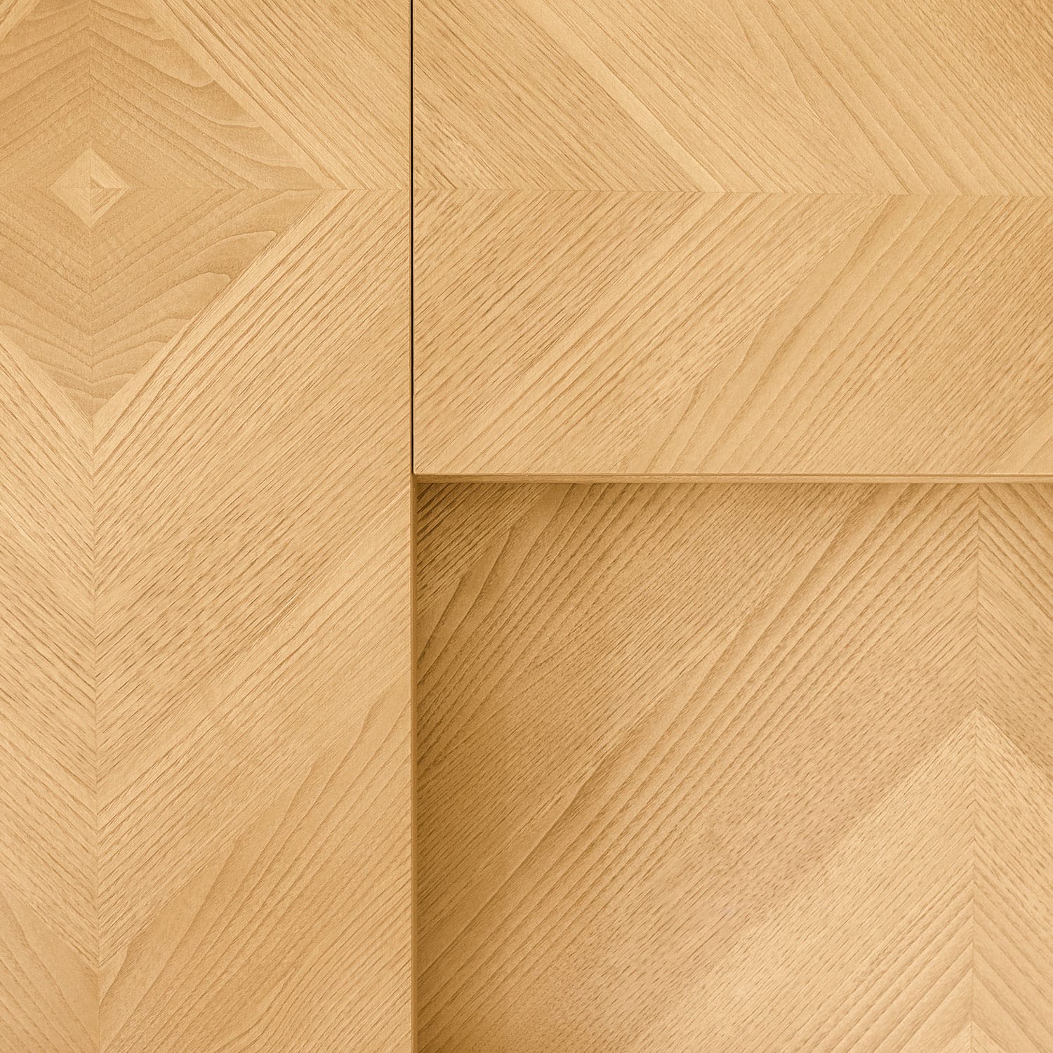 Materiale e caratteristiche: essenza castagno, finitura opaca, geometrie custom, fissaggi a scomparsa