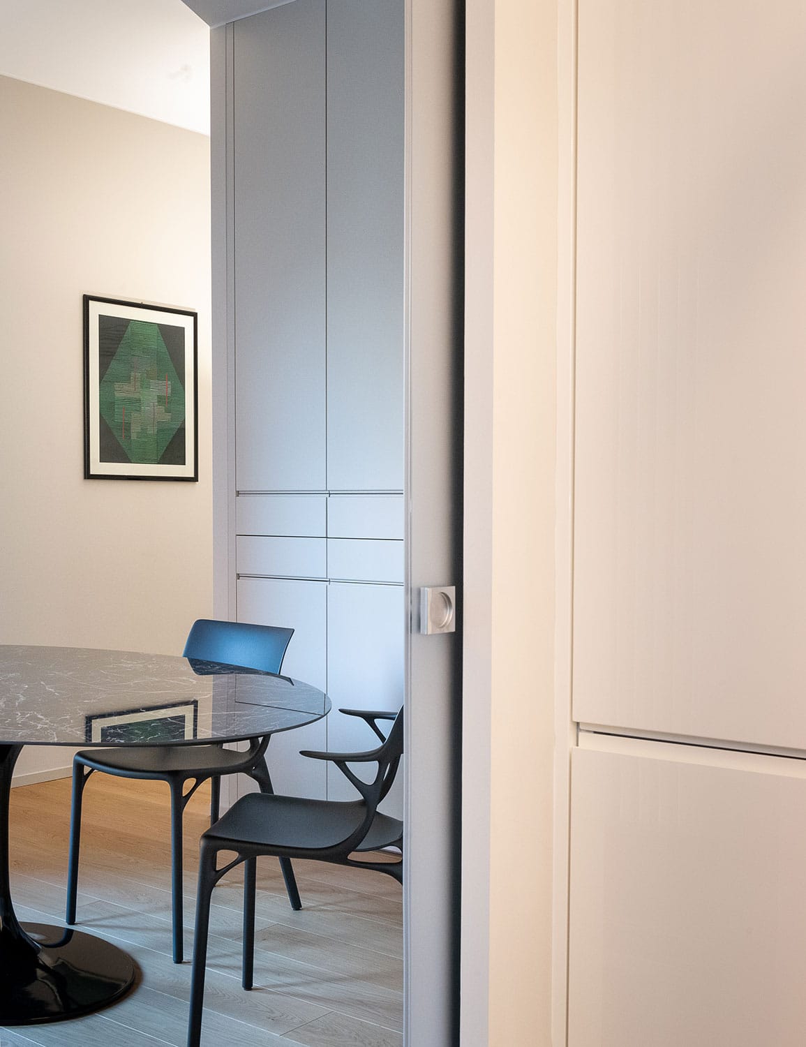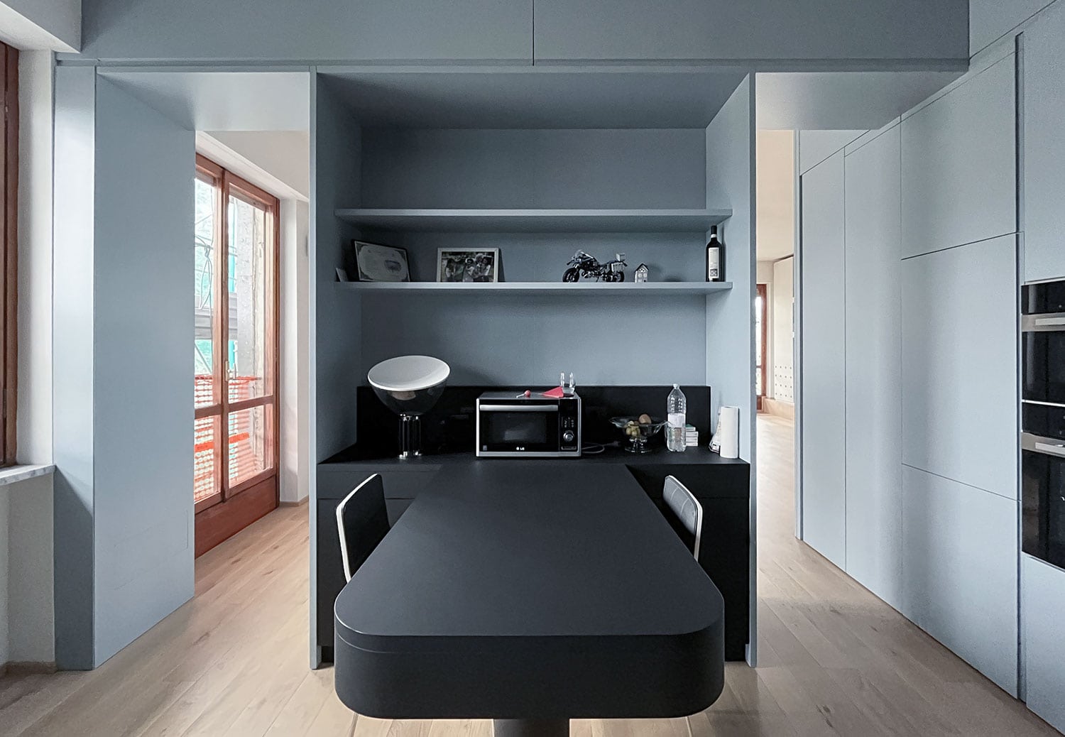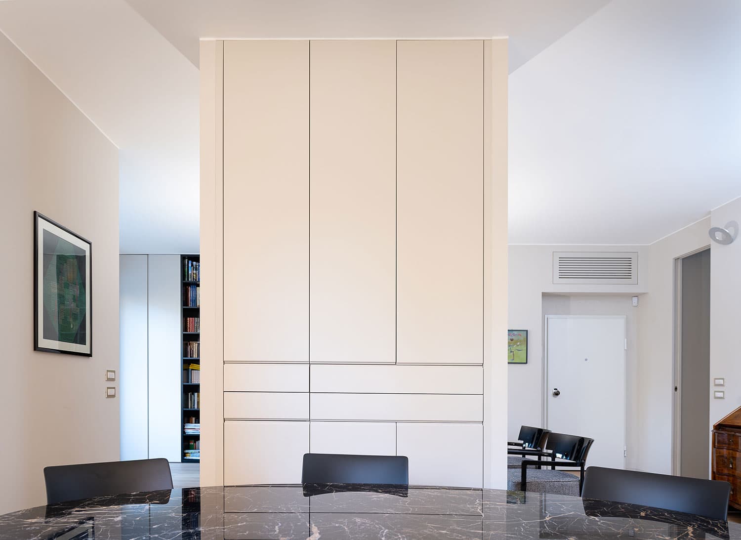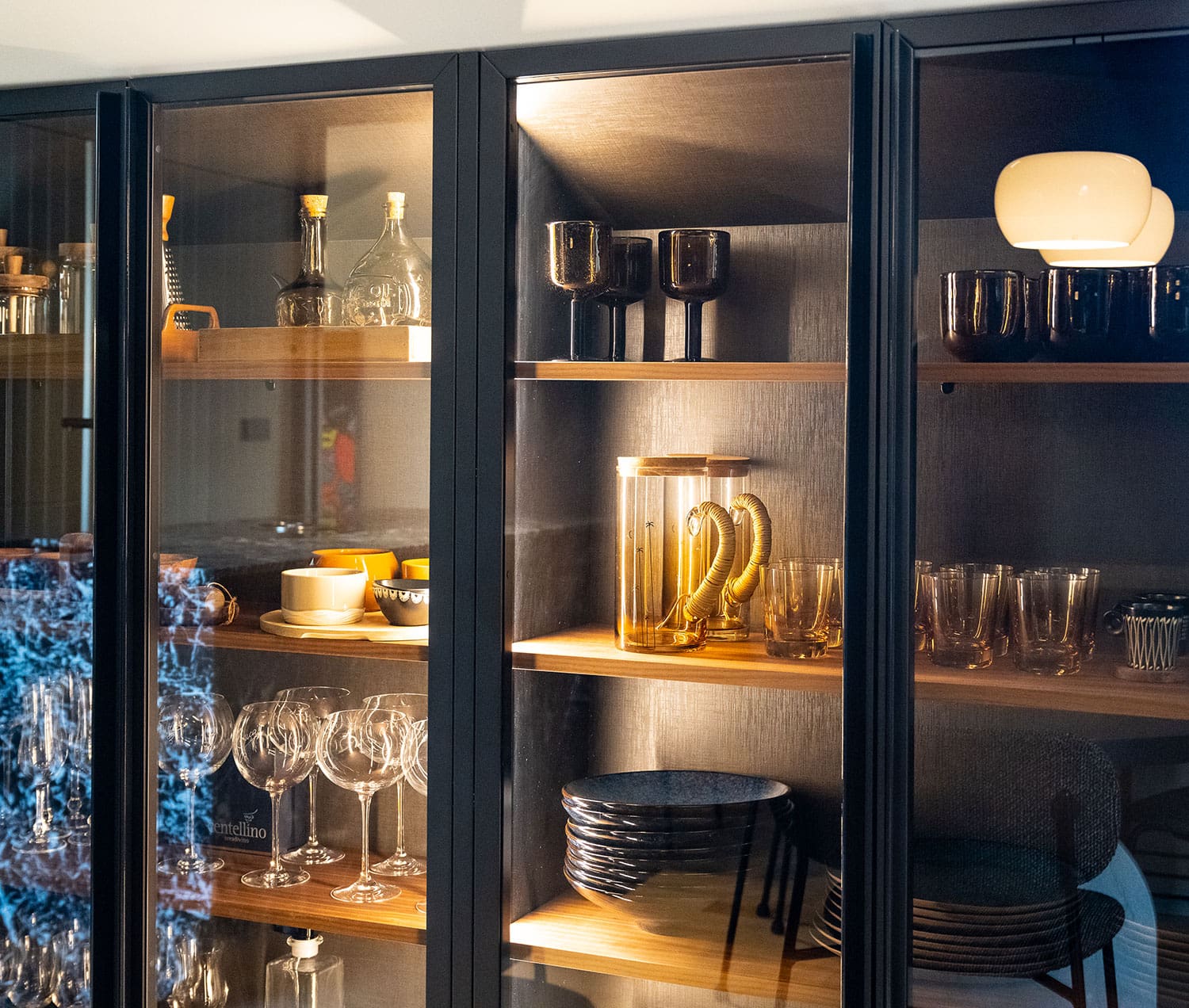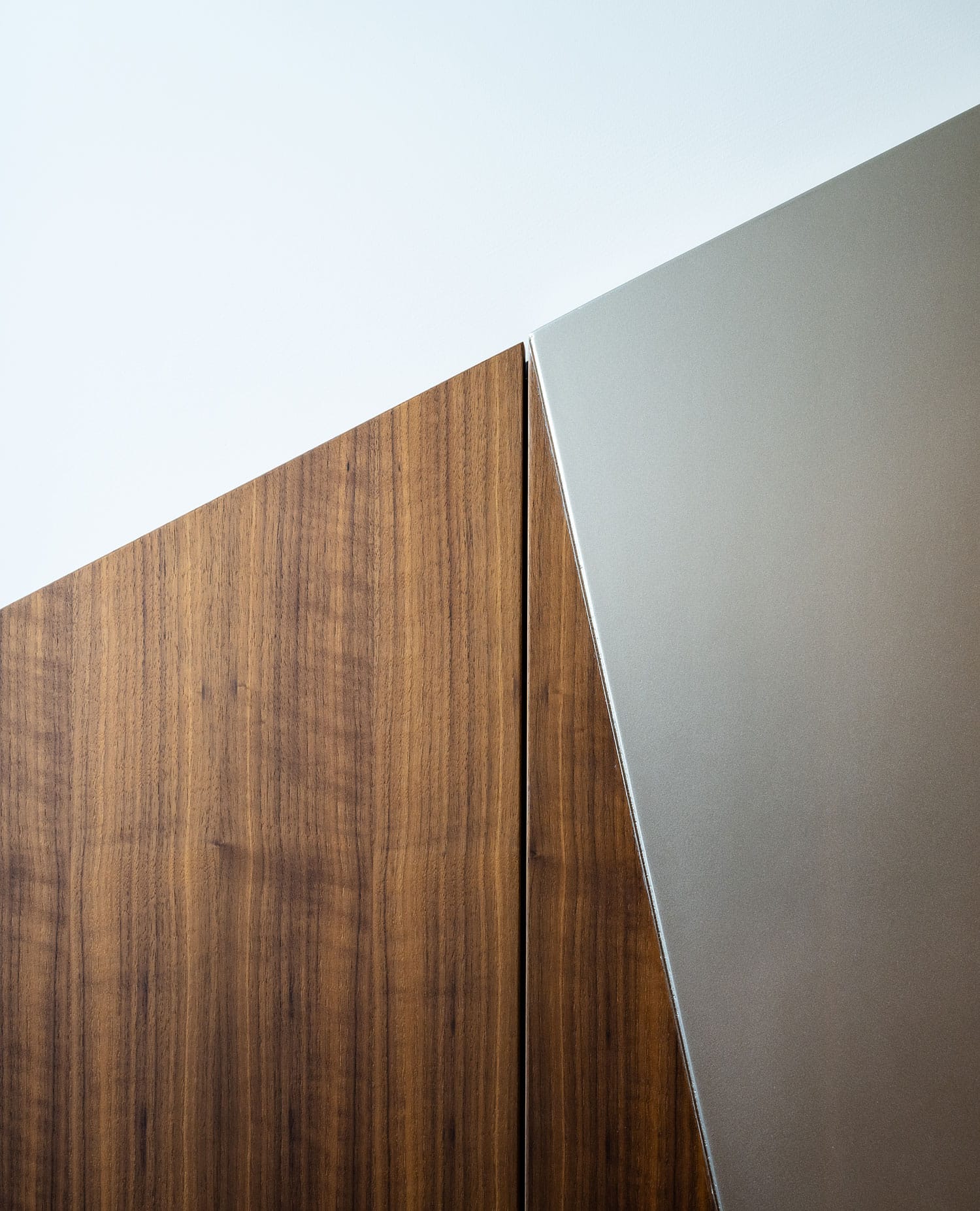 Materiale e caratteristiche: essenza noce canalletto, finiture metallizzate, laminam / fenix, pietre naturali, ante rientranti a scomparsa