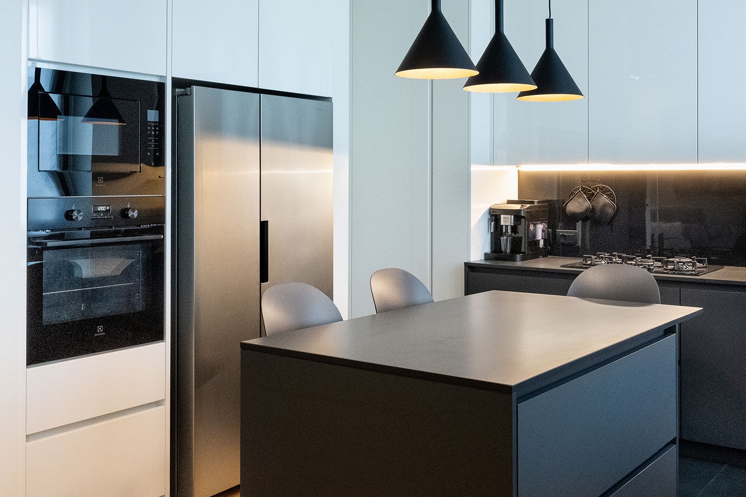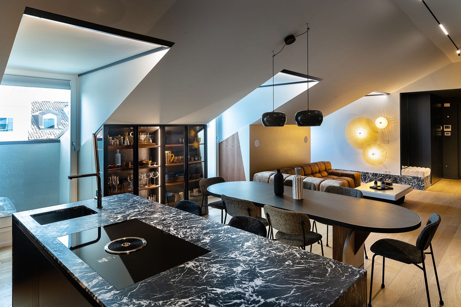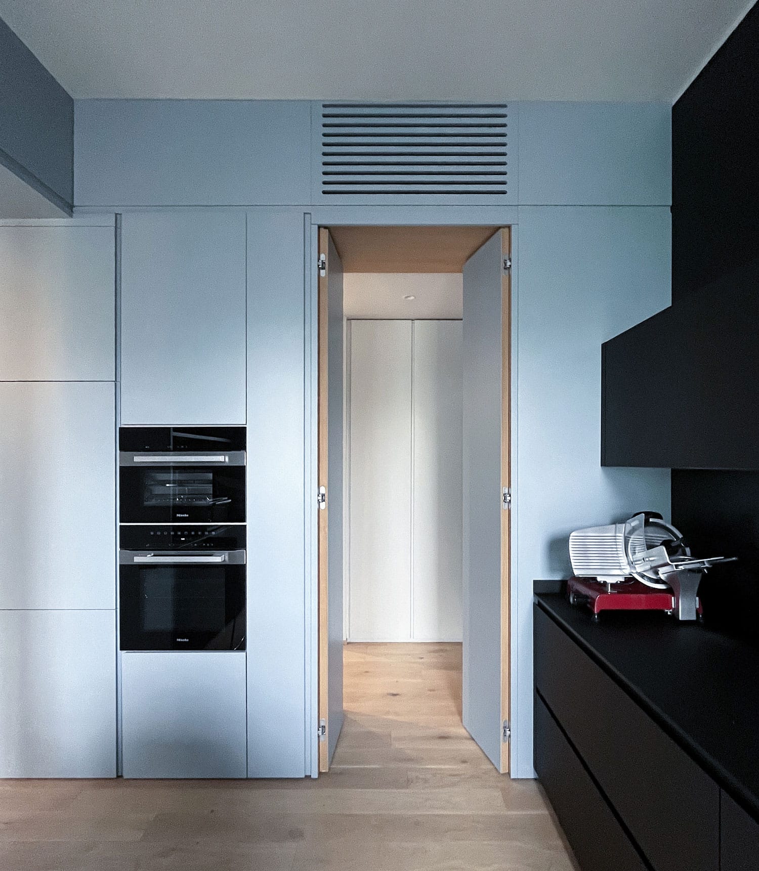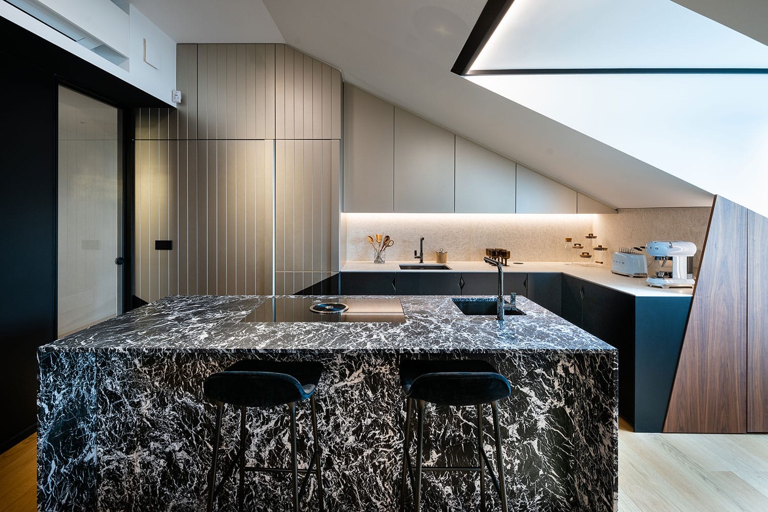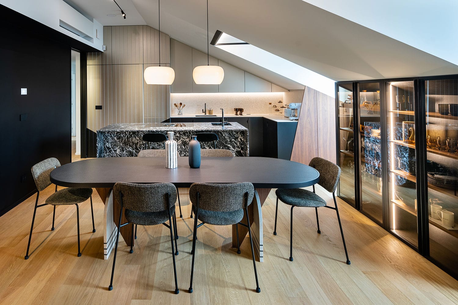 Materiale e caratteristiche: essenza noce canalletto, finiture metallizzate, laminam / fenix, pietre naturali, ante rientranti a scomparsa