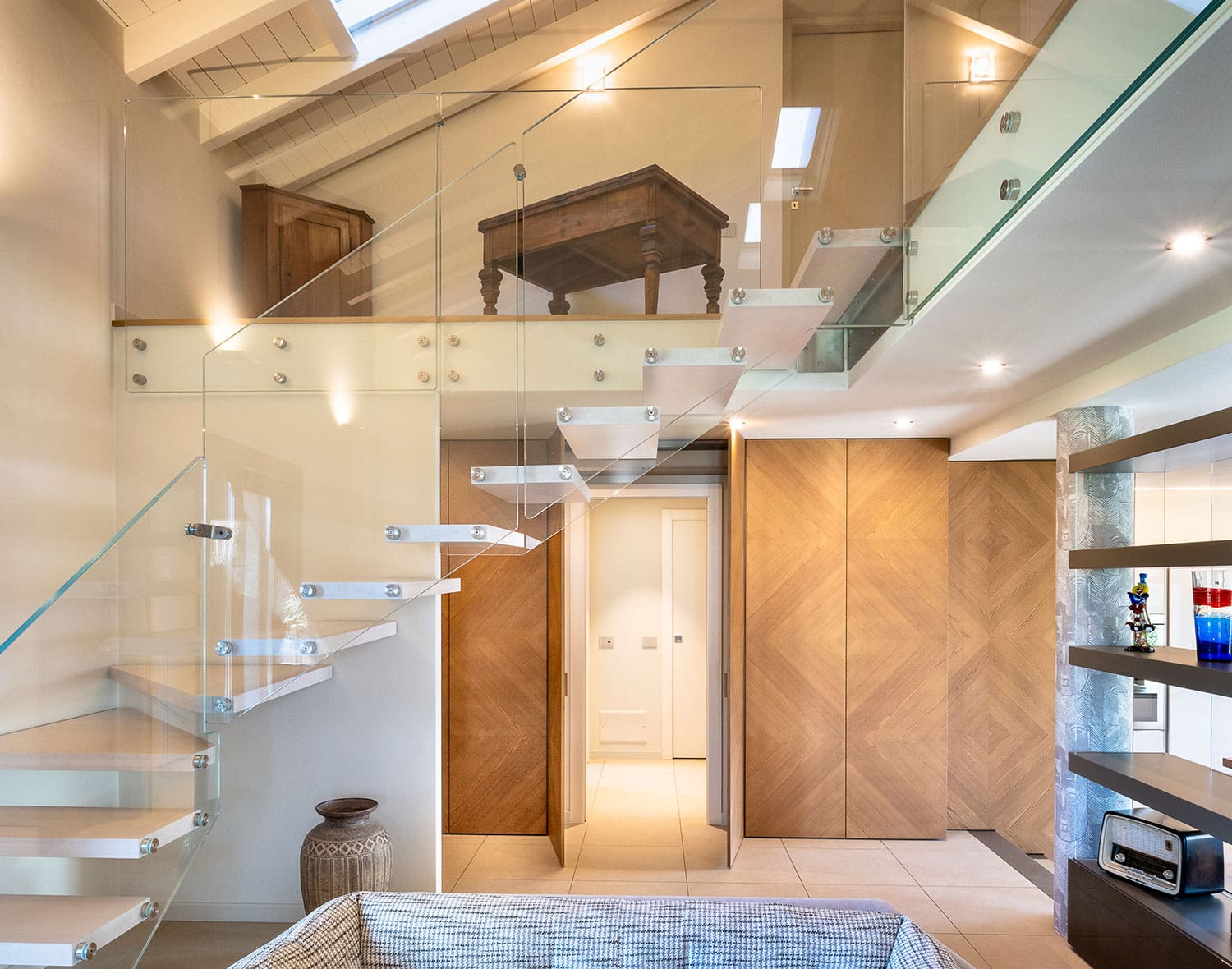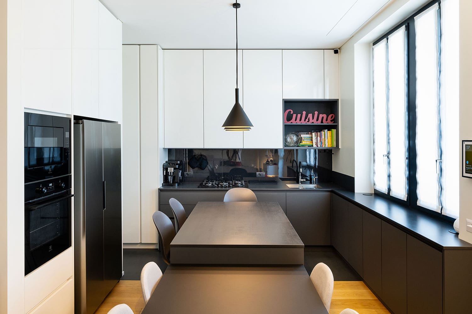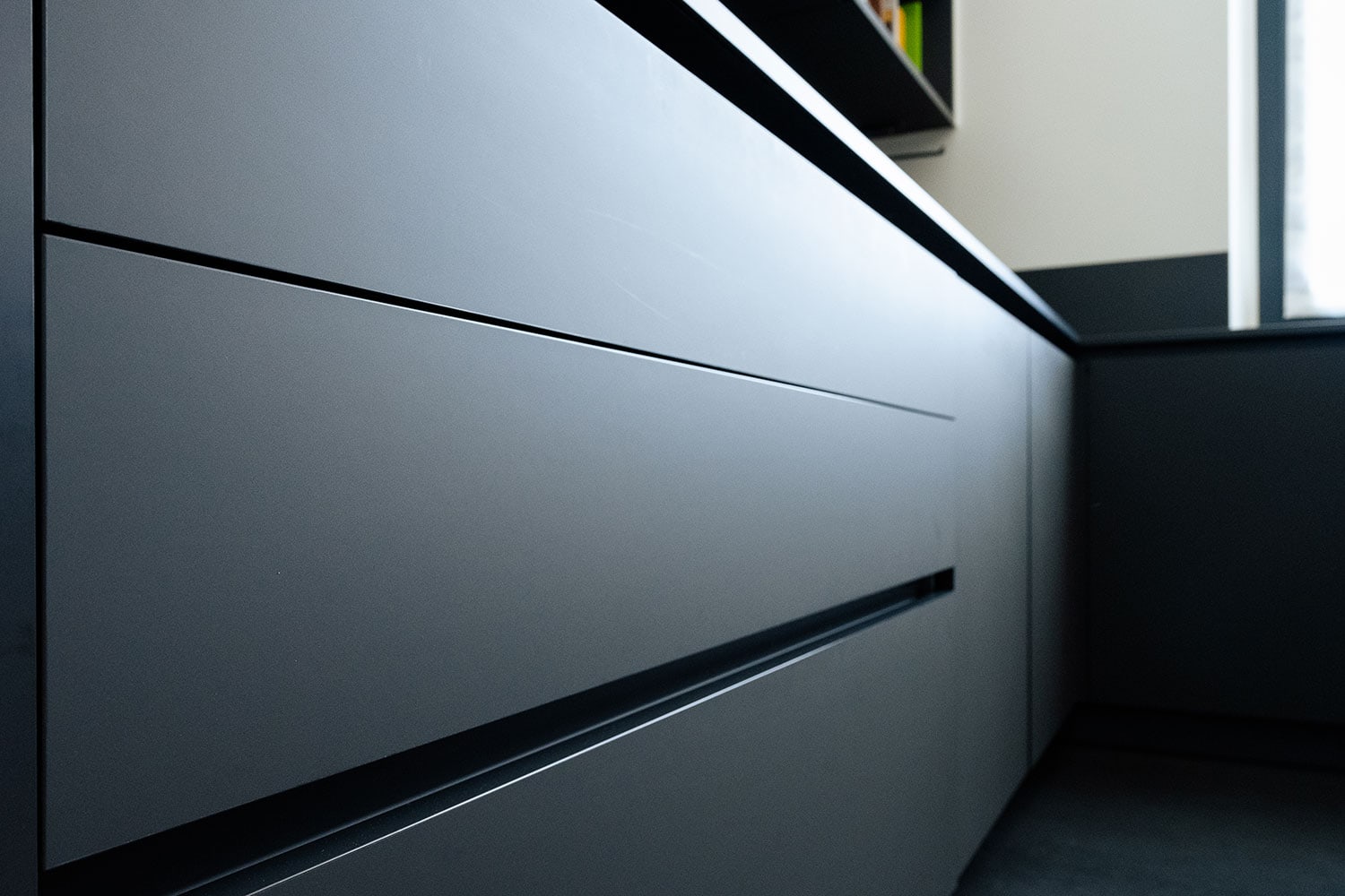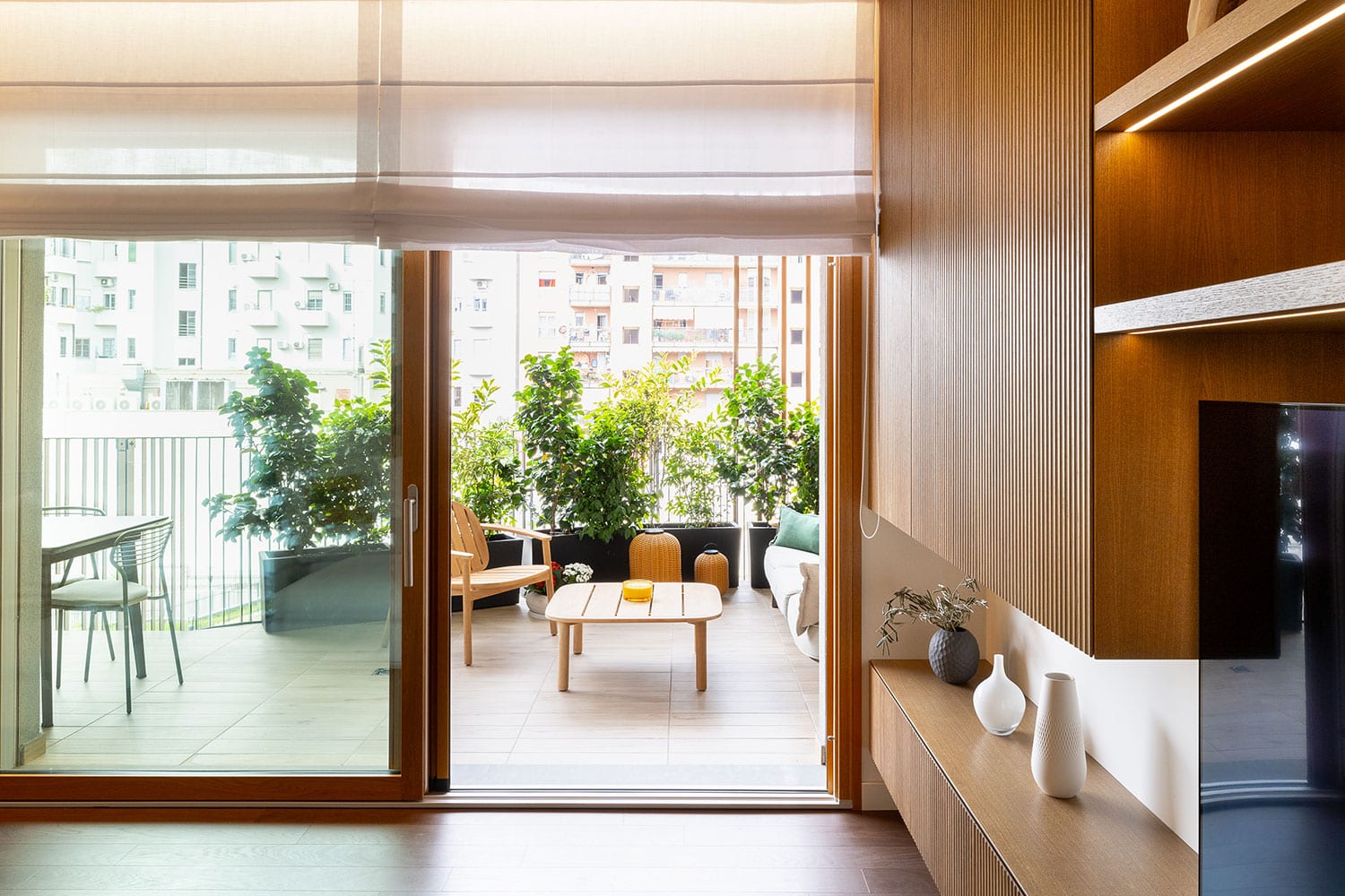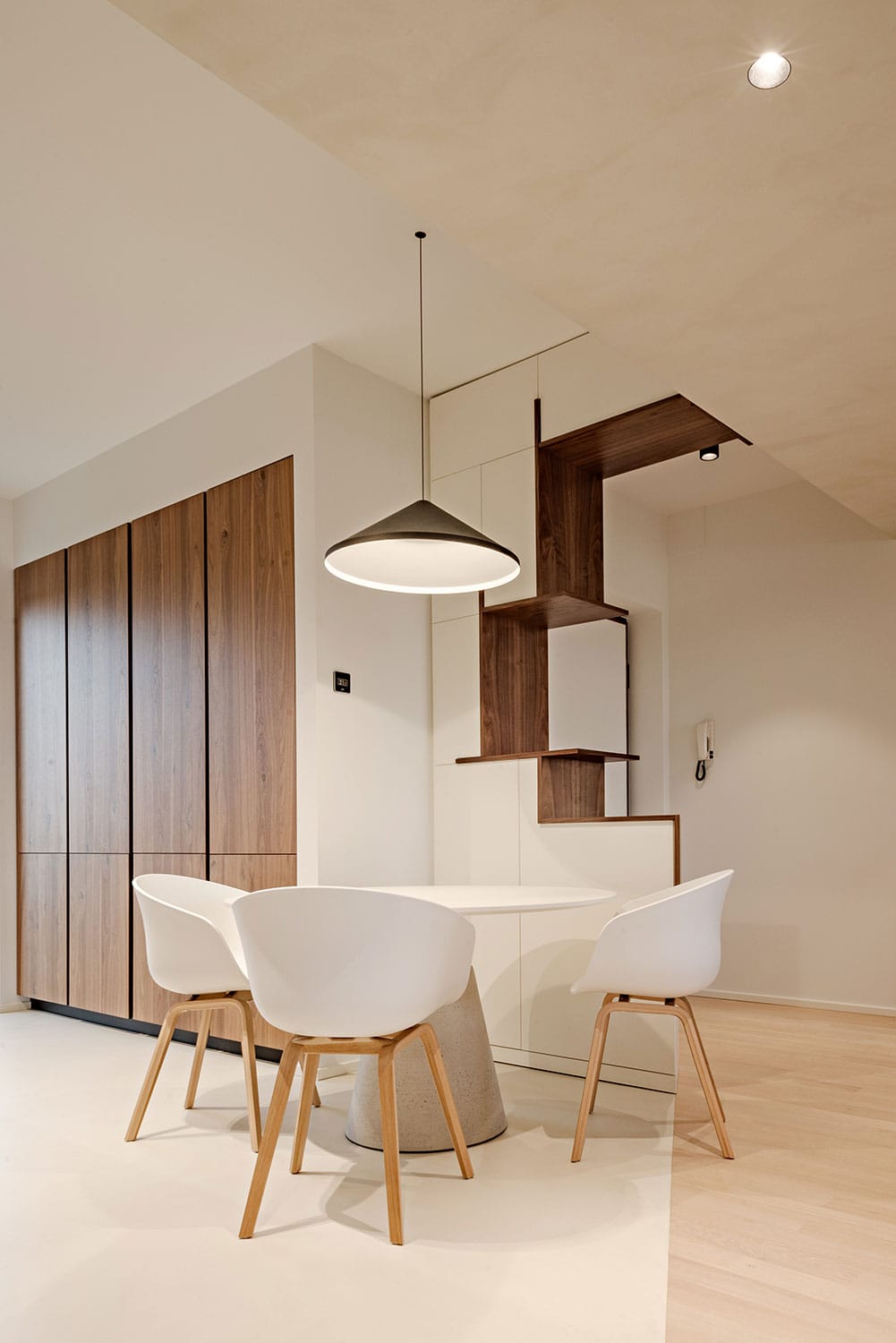 Materiale e caratteristiche: essenza noce canalletto, finiture metallizzate, laminam / fenix, pietre naturali, ante rientranti a scomparsa
