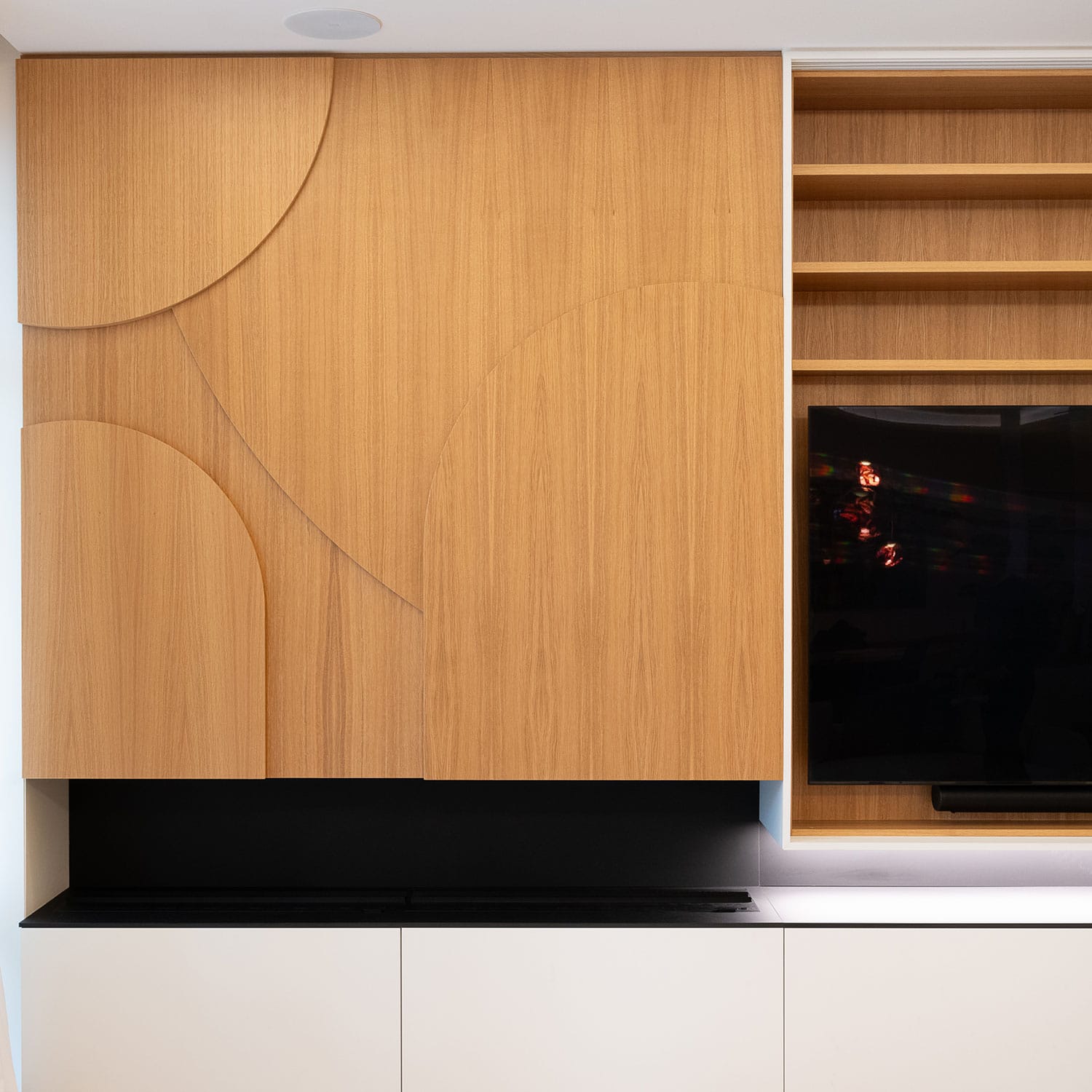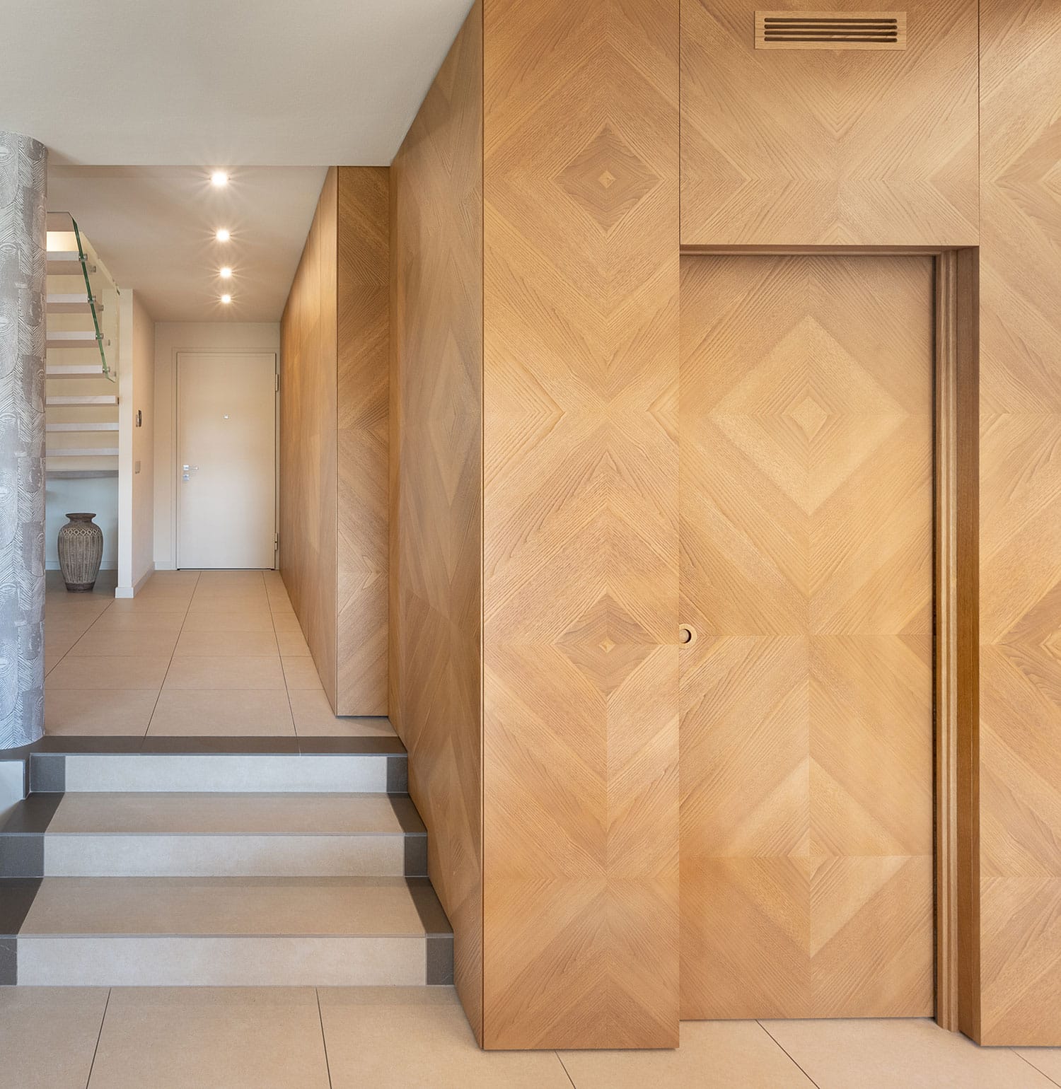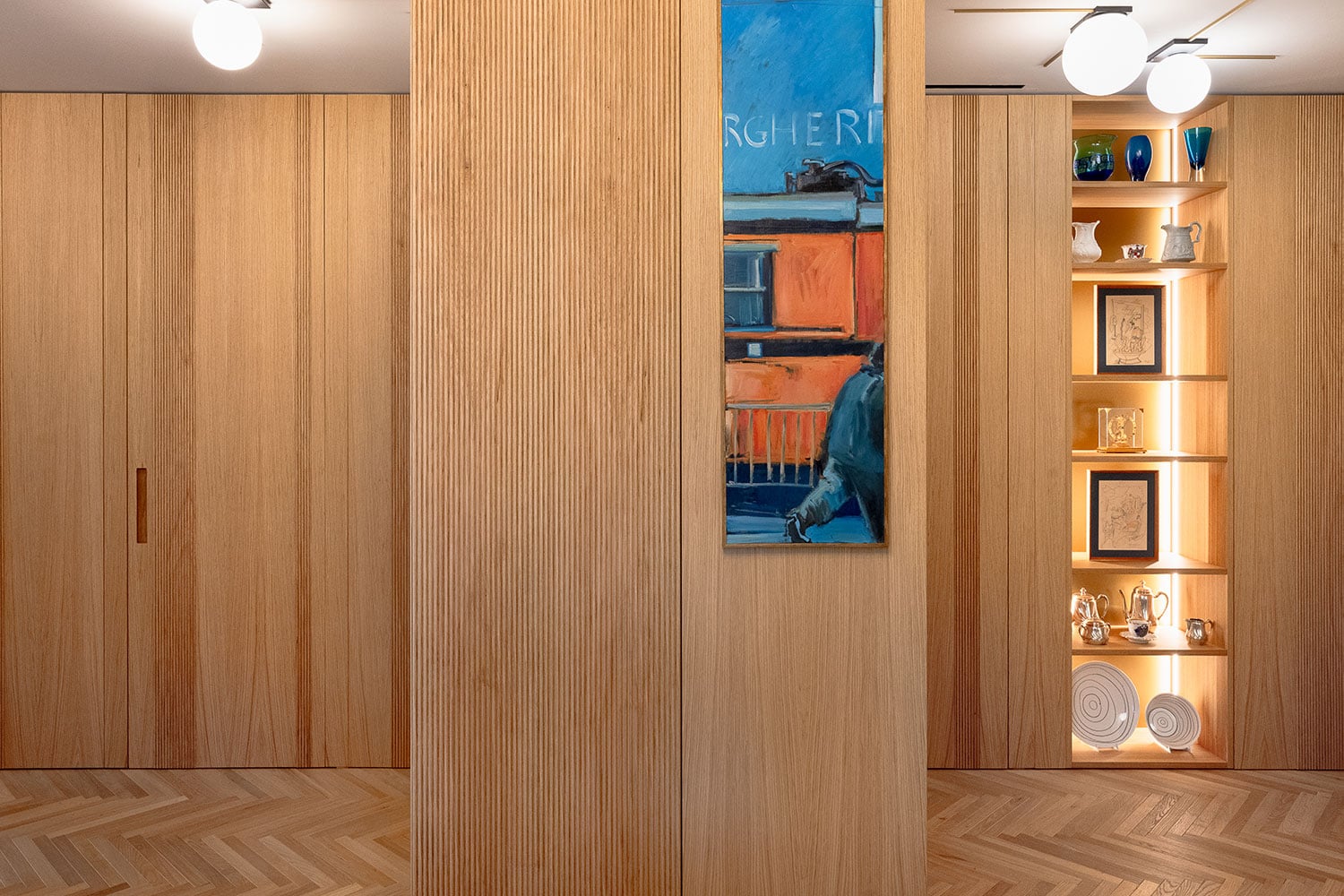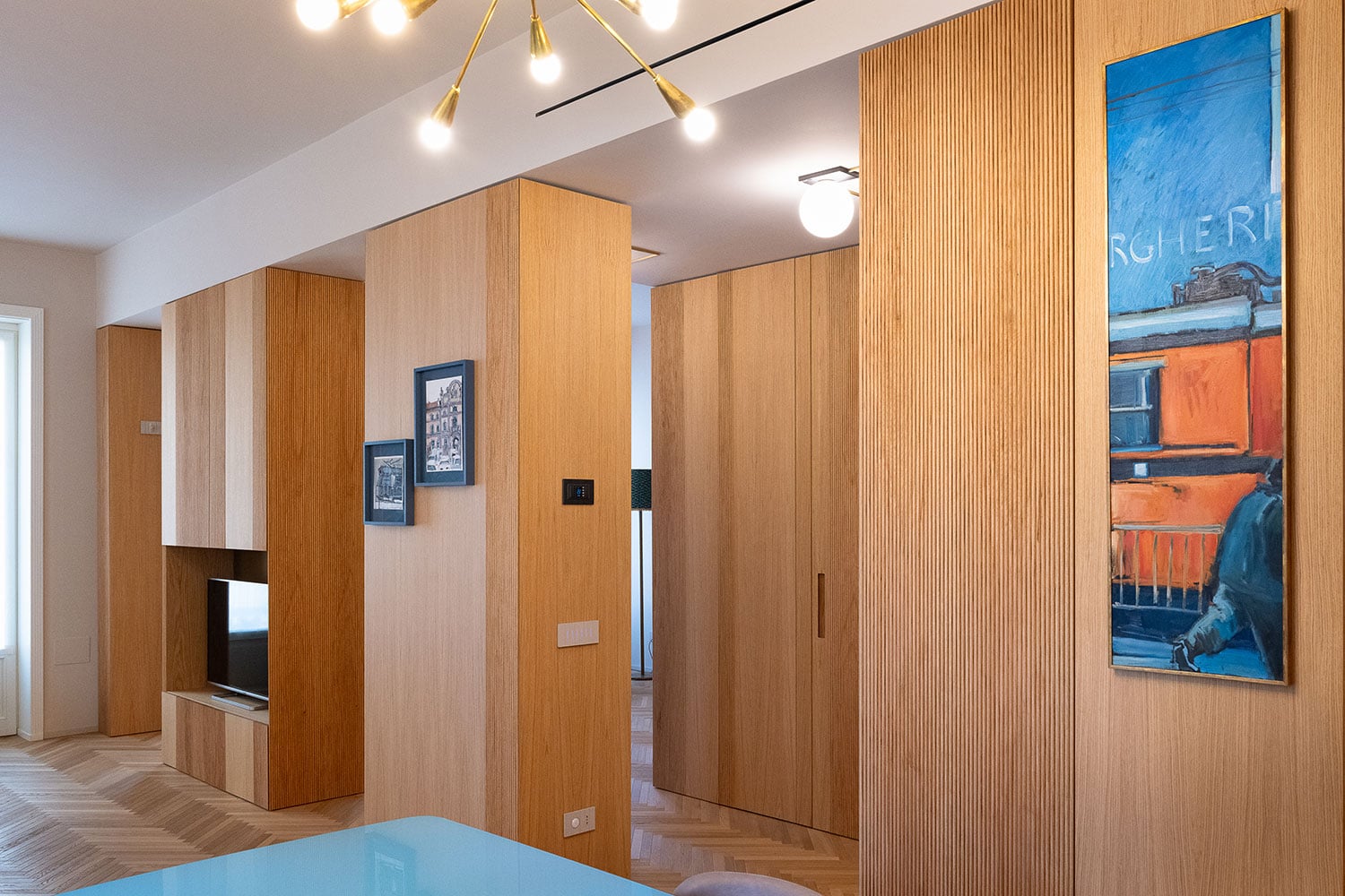 Materiale e caratteristiche: Essenza Rovere, laccature, sistema binari, sistema led integrati, pannelli fresati a disegno