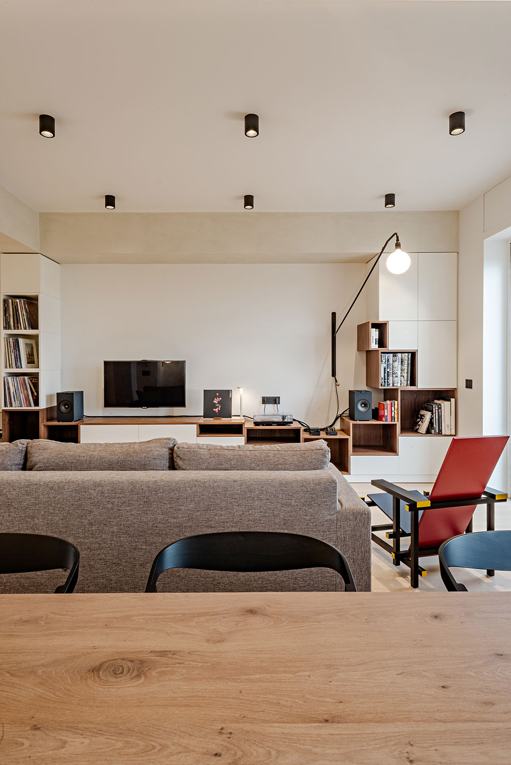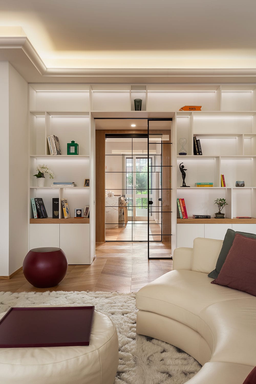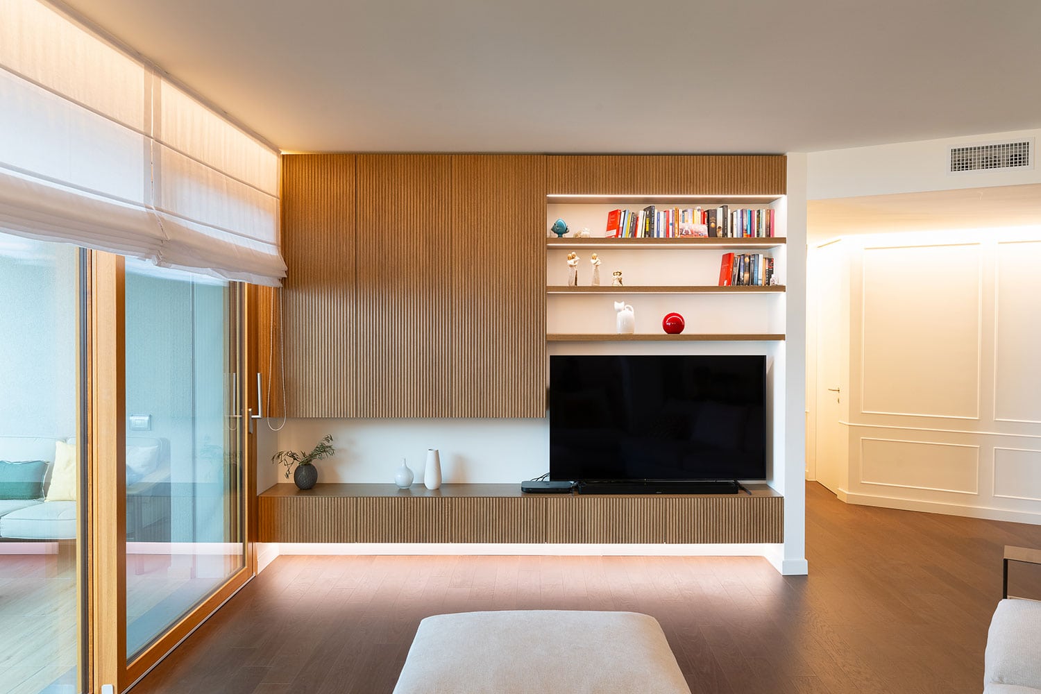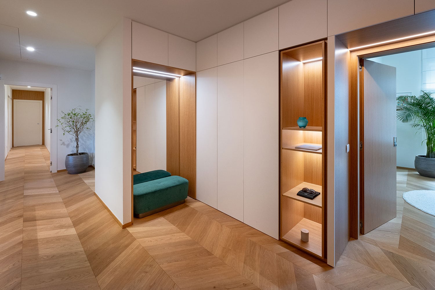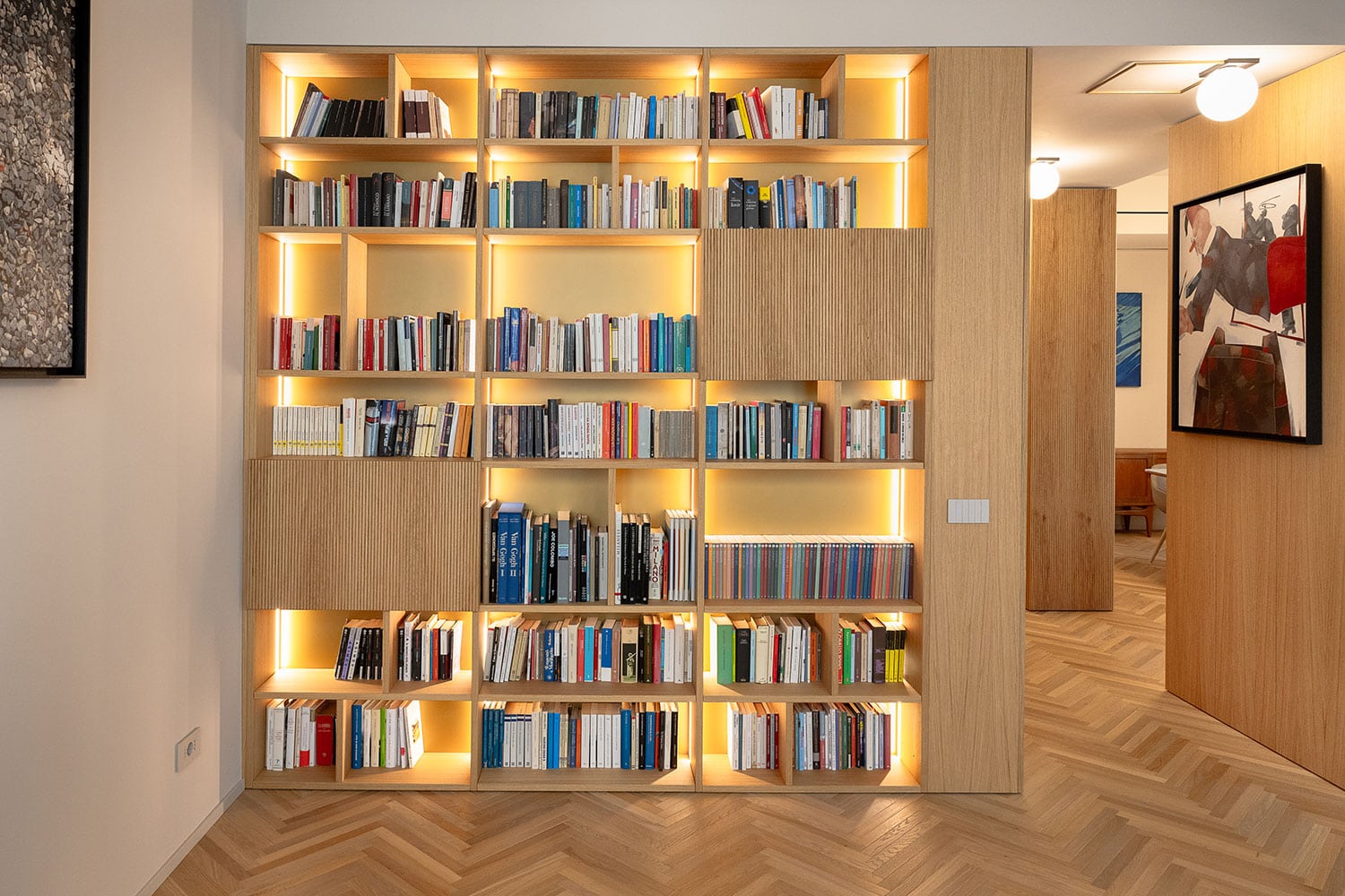 Materiale e caratteristiche: Essenza Rovere, laccature, sistema binari, sistema led integrati, pannelli fresati a disegno