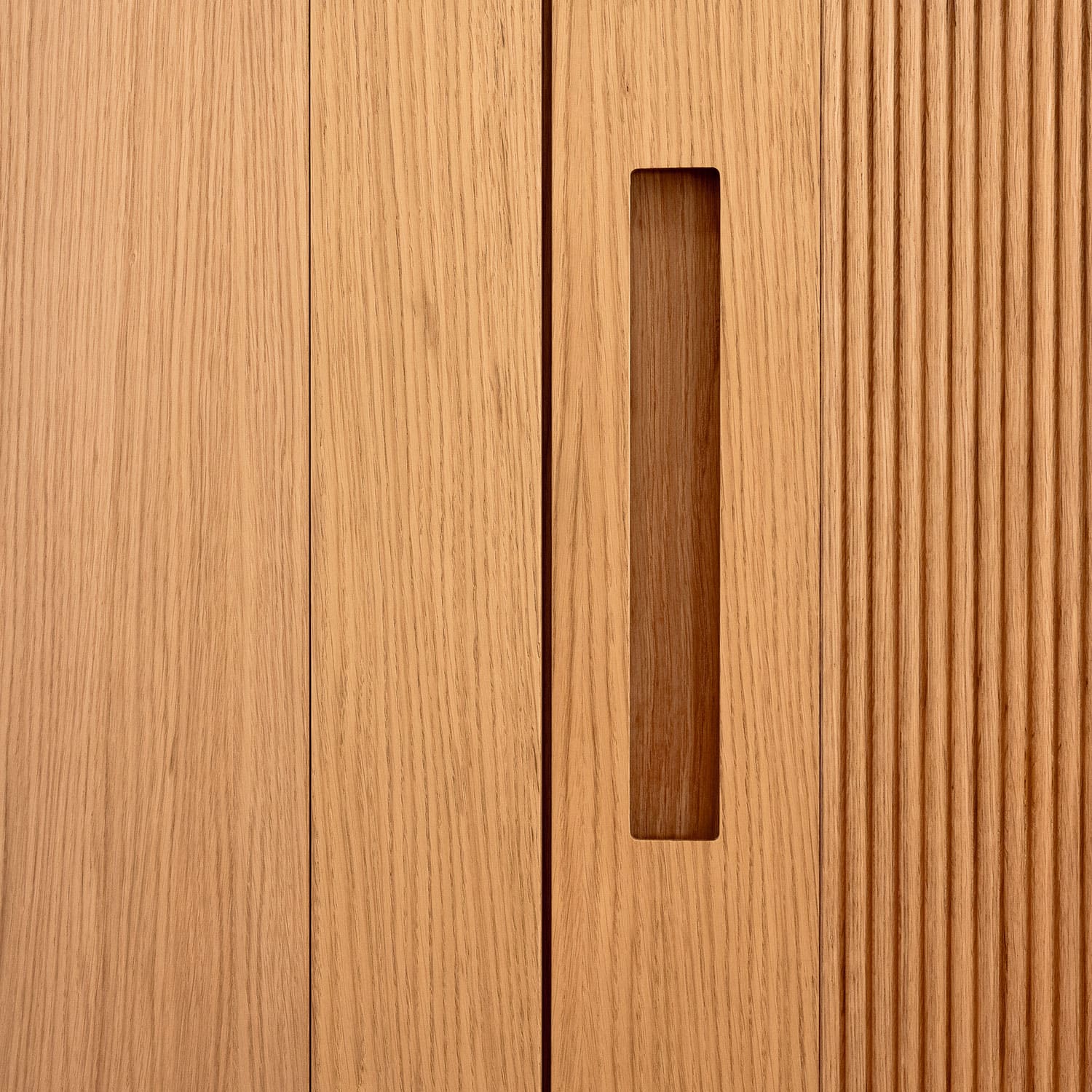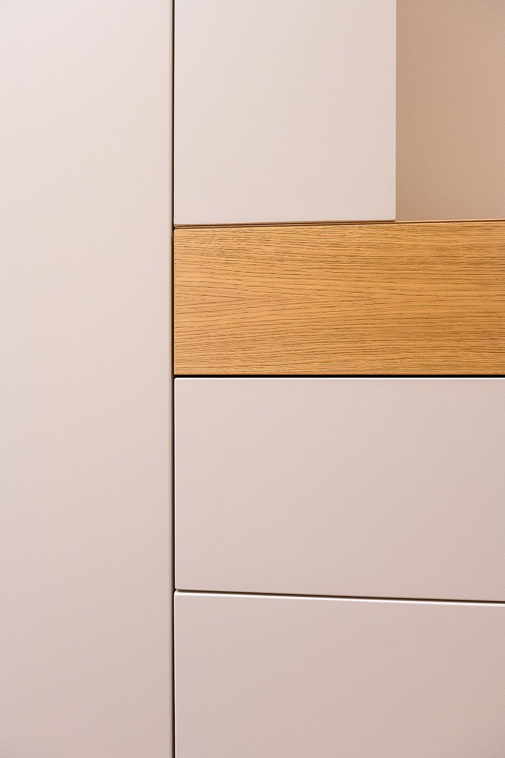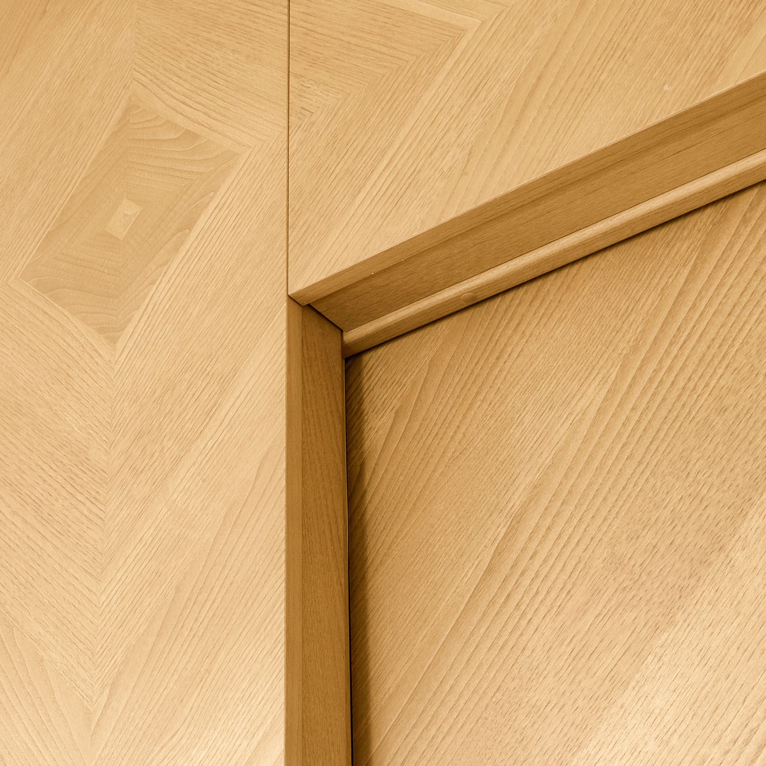 Materiale e caratteristiche: essenza rovere, fenix, finiture laccate a campione, maniglie in massello pantografate
