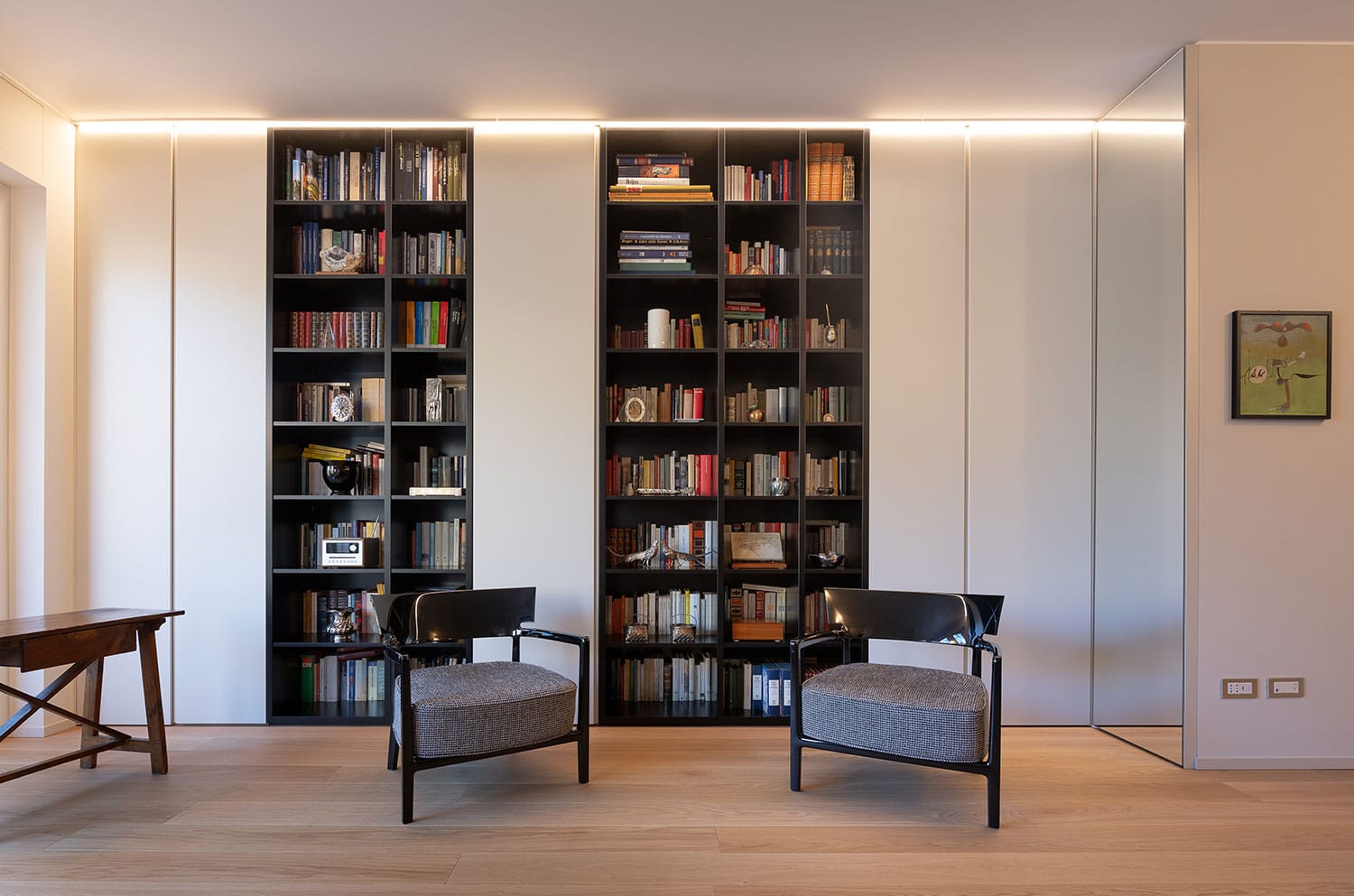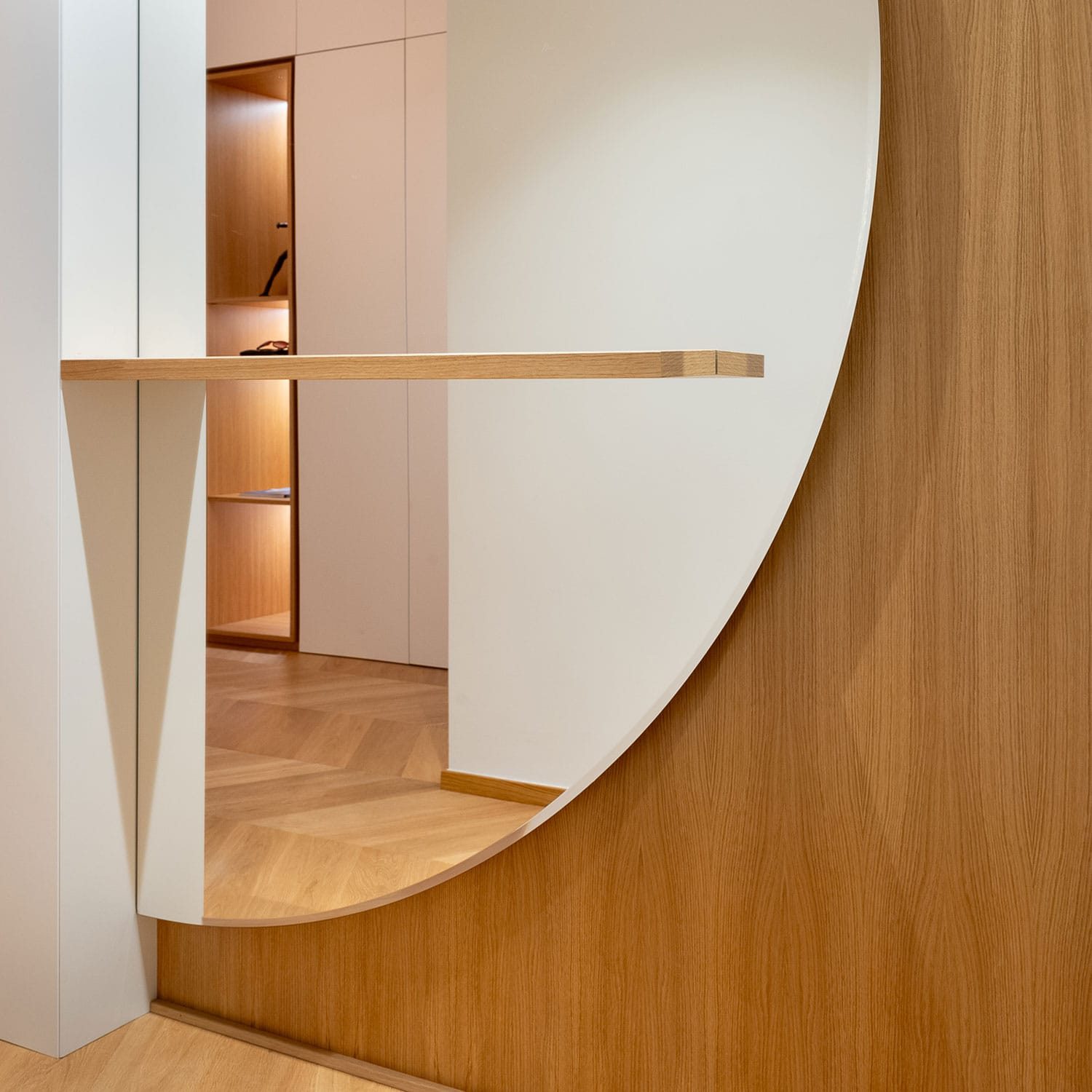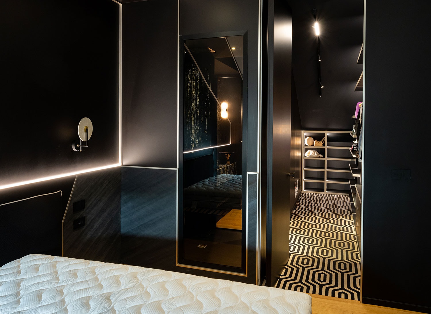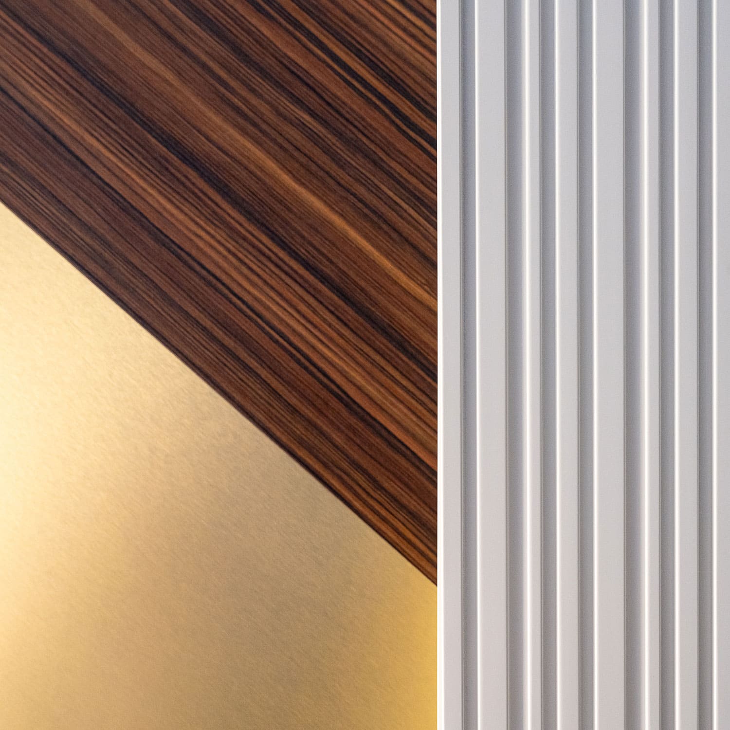 Materiale e caratteristiche: sistema boiserie, arredi ad intarsio, ottone spazzolato, vano tecnico fonoassorbente, pannellature fresate a disegno