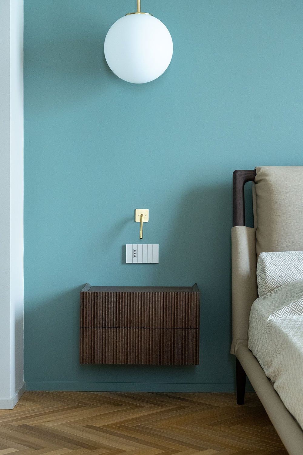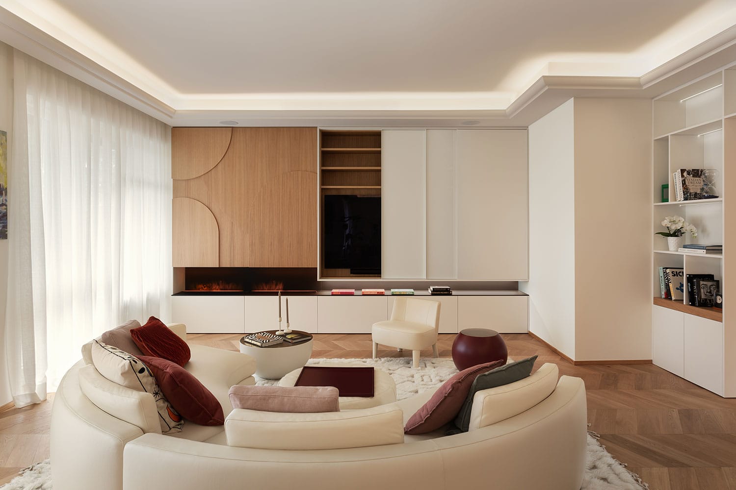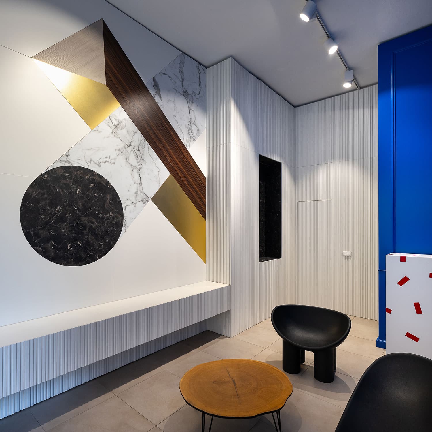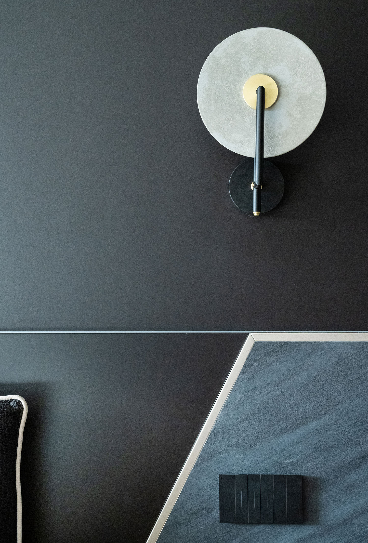 Materiale e caratteristiche: sistema boiserie, arredi ad intarsio, ottone spazzolato, vano tecnico fonoassorbente, pannellature fresate a disegno