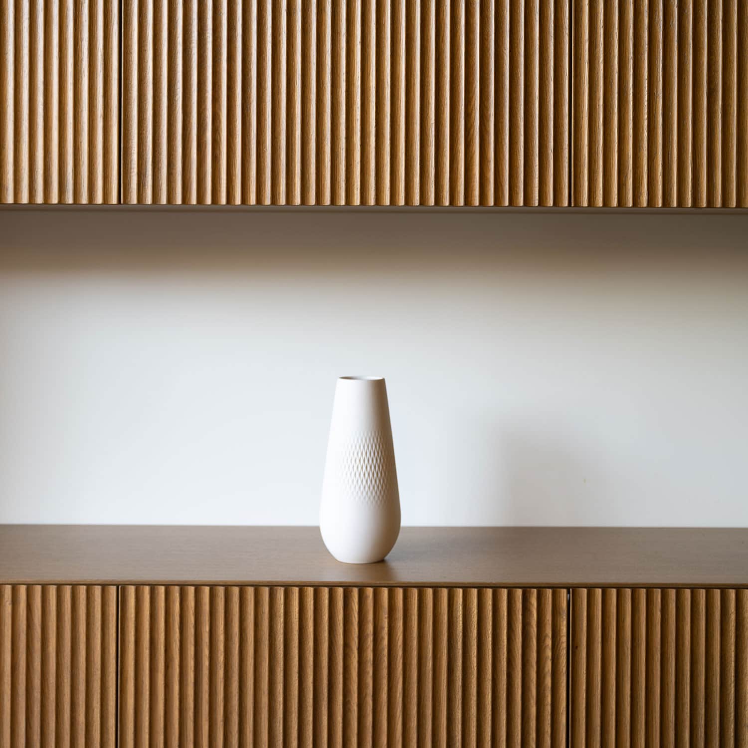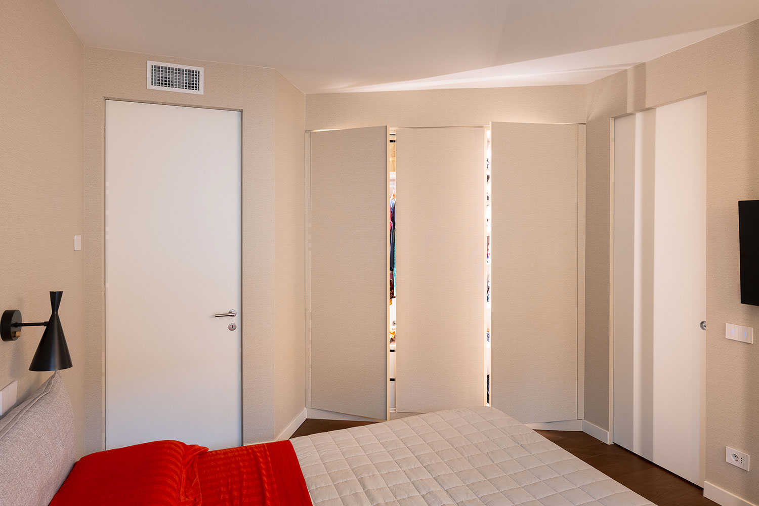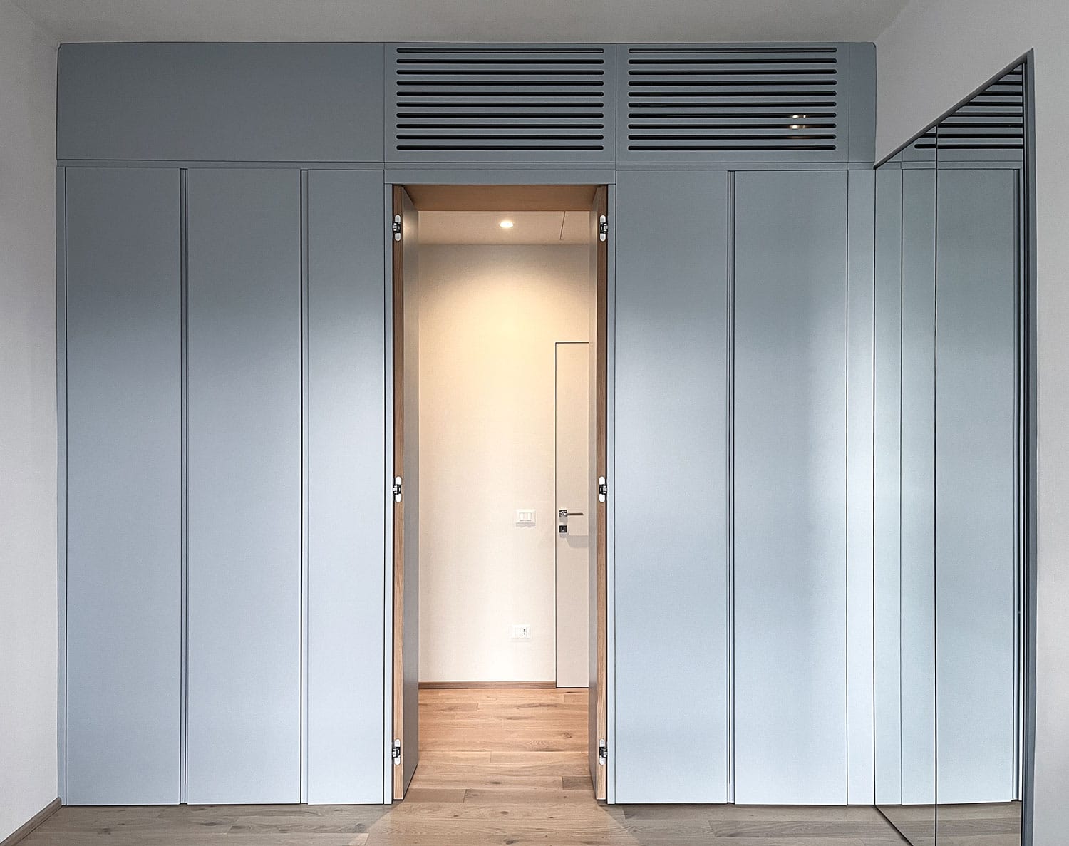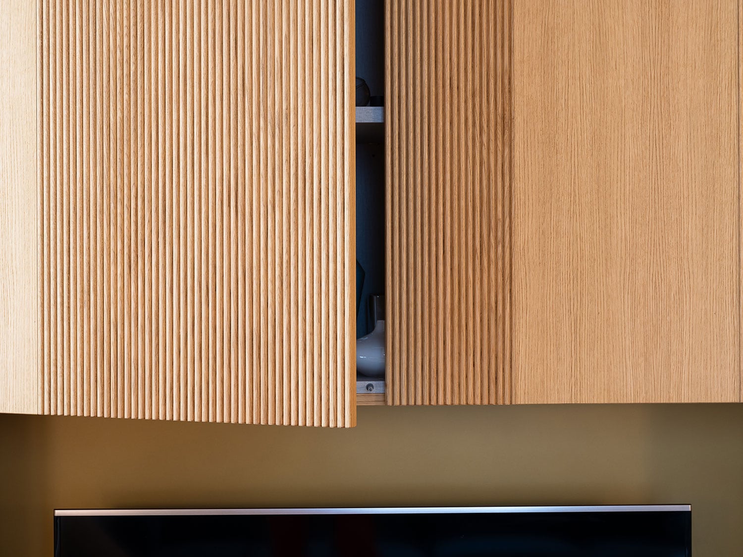 Materiale e caratteristiche: essenza rovere fresato, cannettature laccate, corian, illuminazione integrata, rivestimento cabina armadio