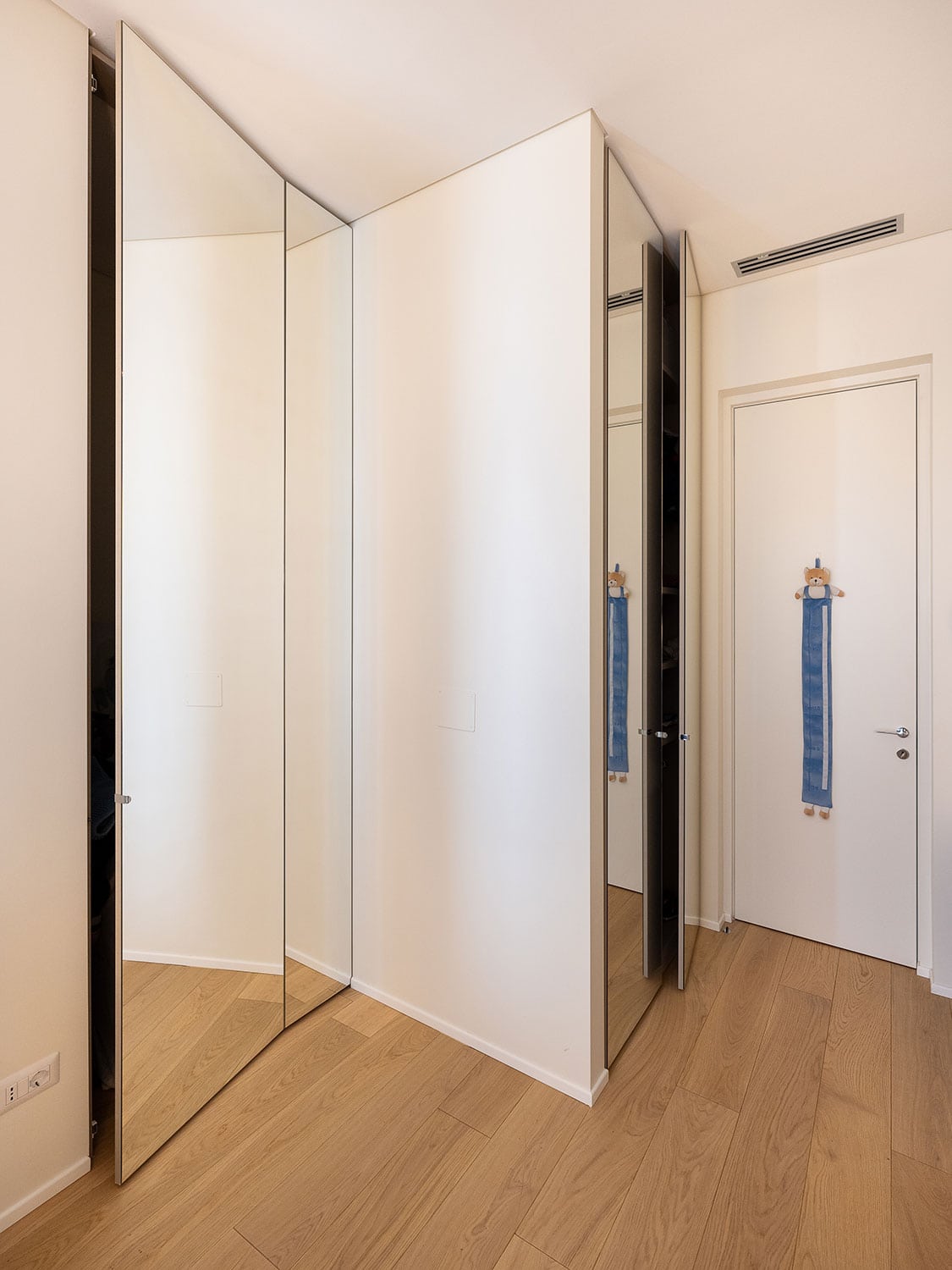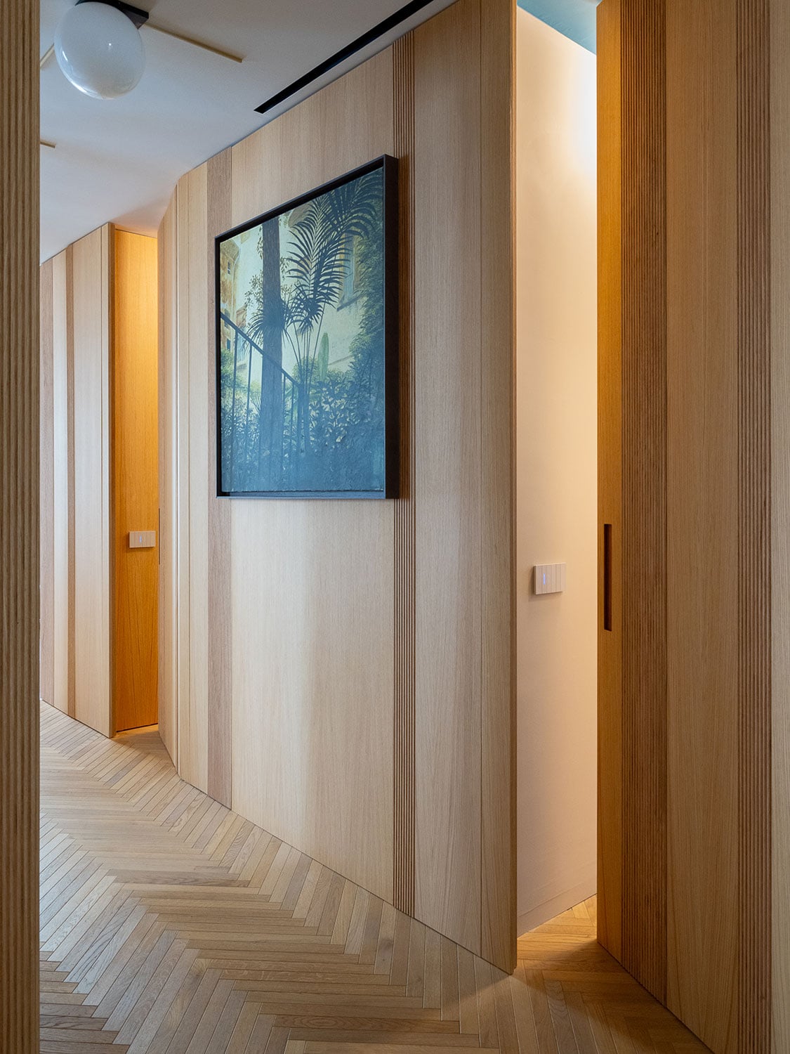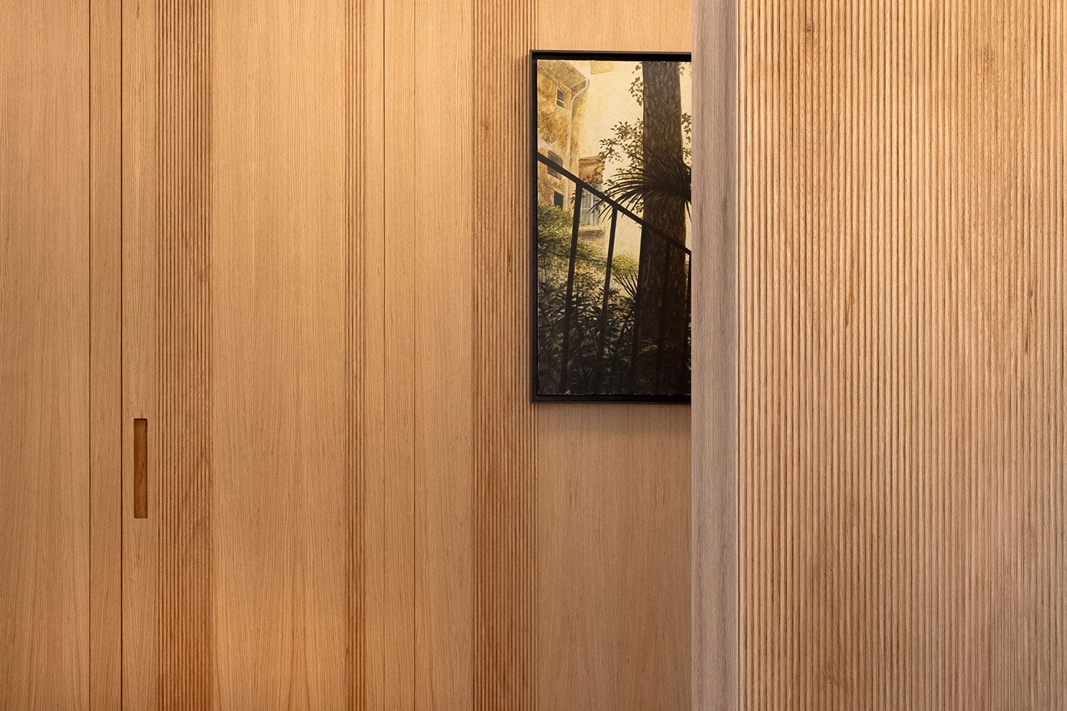 Materiale e caratteristiche: essenza rovere fresato, cannettature laccate, corian, illuminazione integrata, rivestimento cabina armadio