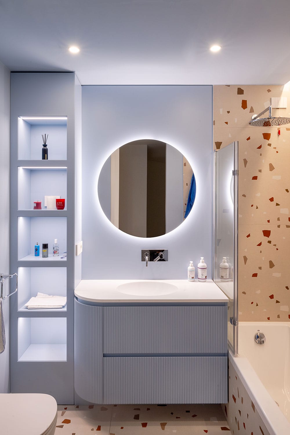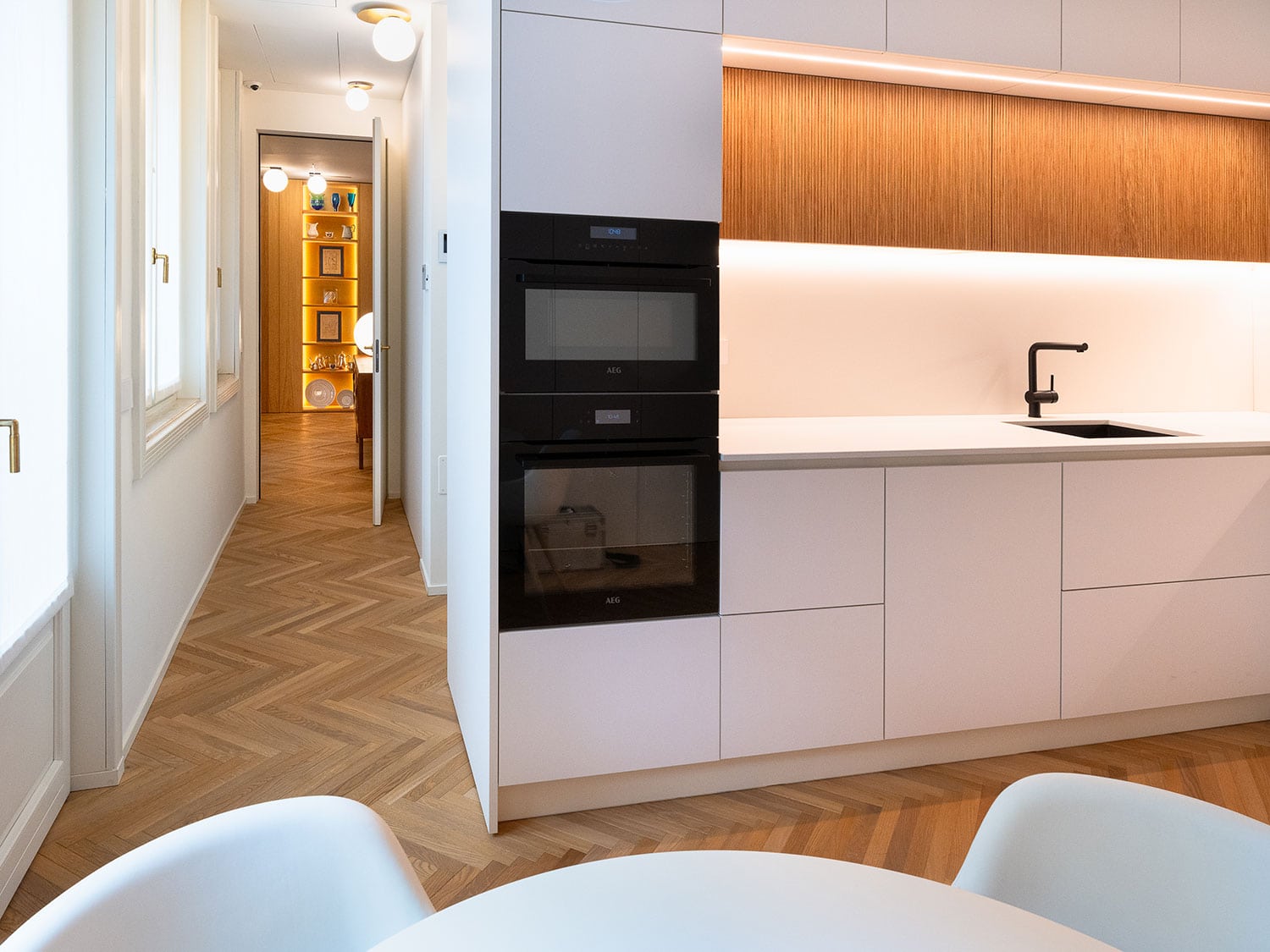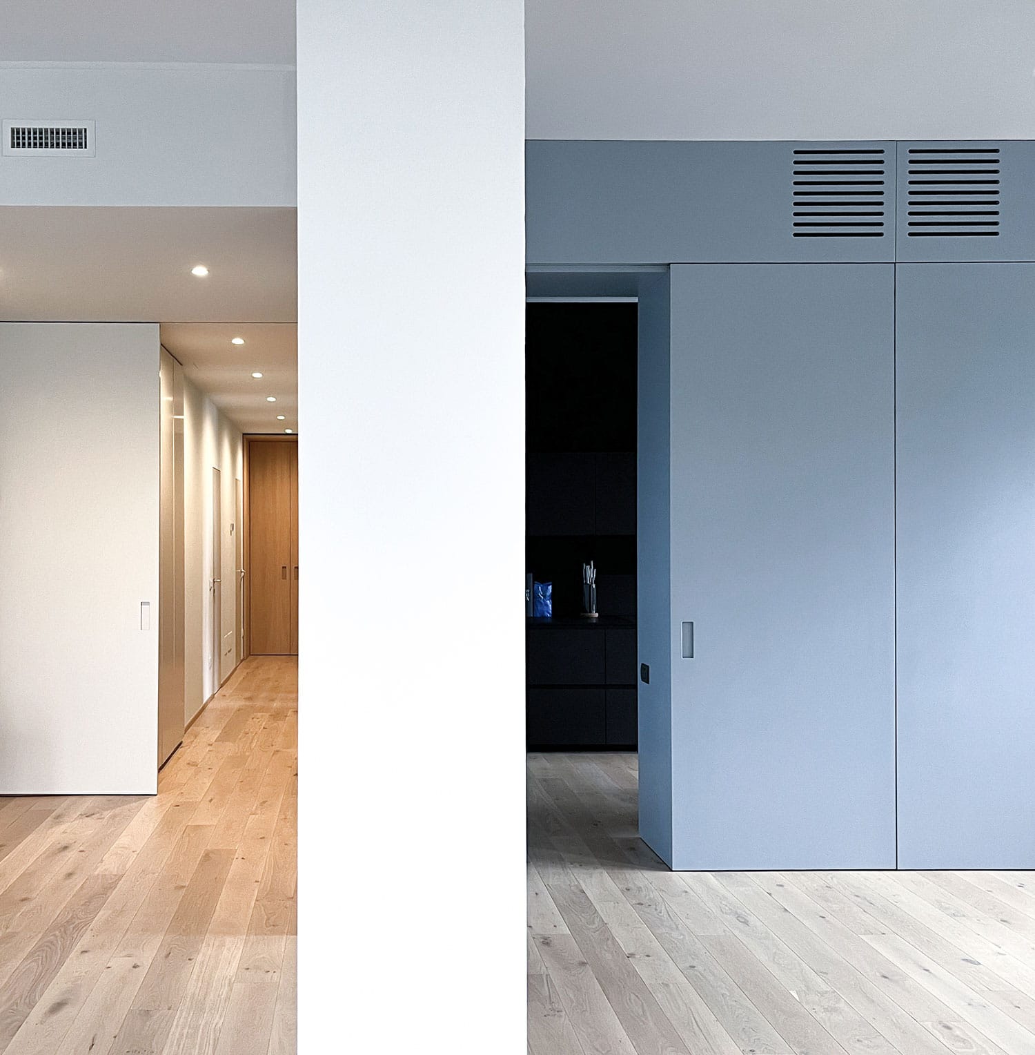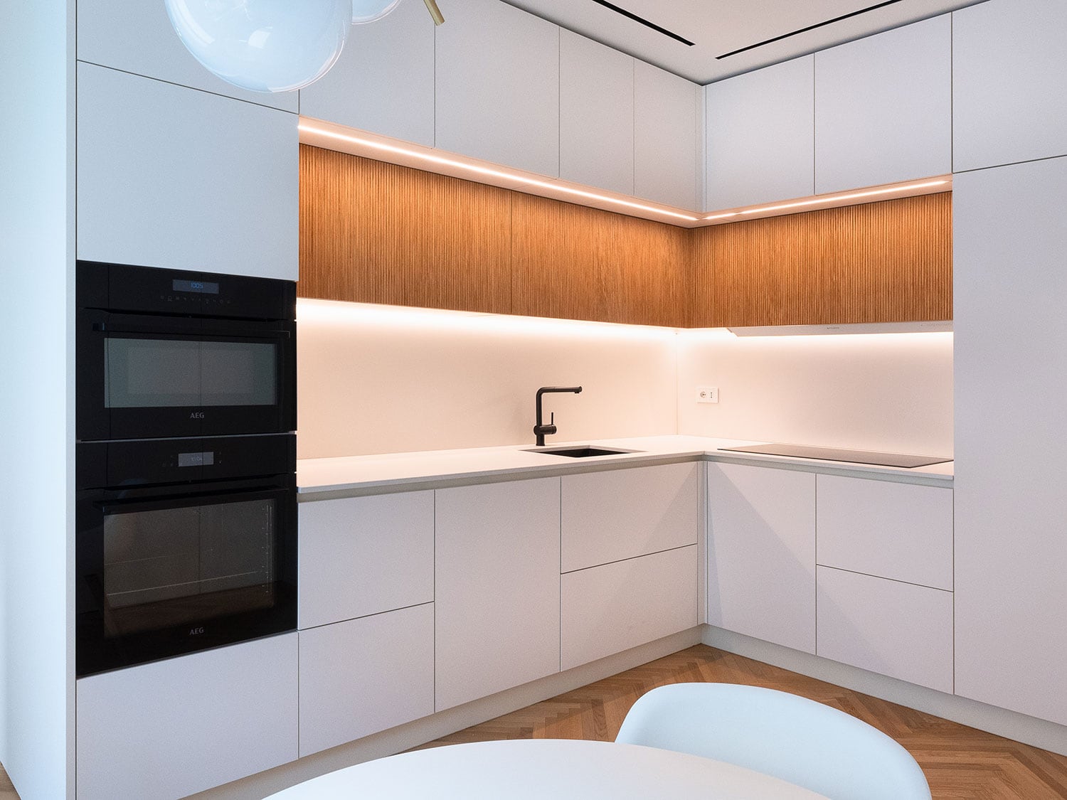 Materiale e caratteristiche: essenza rovere fresato, cannettature laccate, corian, illuminazione integrata, rivestimento cabina armadio