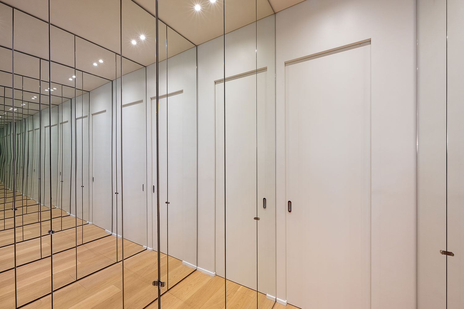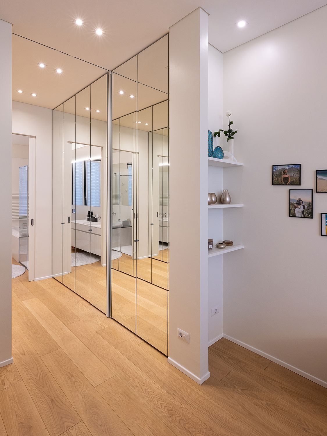 Materiale e caratteristiche: laccatura lucida spazzolata, laminam, ante in allegerito, specchi extra chiaro