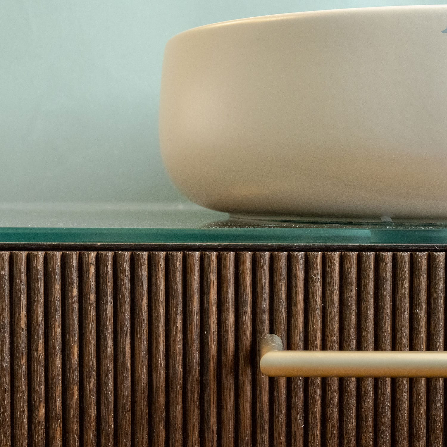 Materiale e caratteristiche: essenza rovere, fenix/dekton, finitura naturale / cannettata, finitura ottone brunito, illuminazione integrata